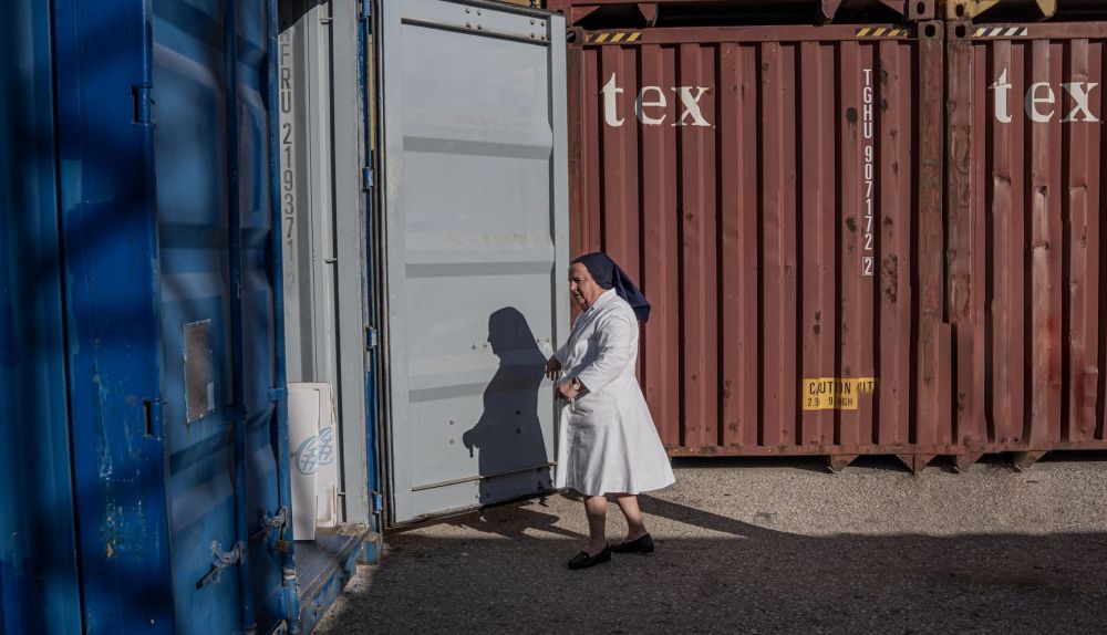 A sor Emilia se le saltan las lágrimas. Emocionada, logra articular palabra dejando ver que el servicio a los demás es su motor. “Digo con muchísima satisfacción que este contenedor que estamos preparando es el número 33, aquí entran unas 560 cajas y, cada una, con unos 60 kilos”, expresa mientras señala los cartones que les dona la empresa Guala. “Garbanzo a granel” o “arroz y pasta” se lee en los distintos carteles. Aprovecha cada hueco del espacio para poder enviar la máxima ayuda posible.