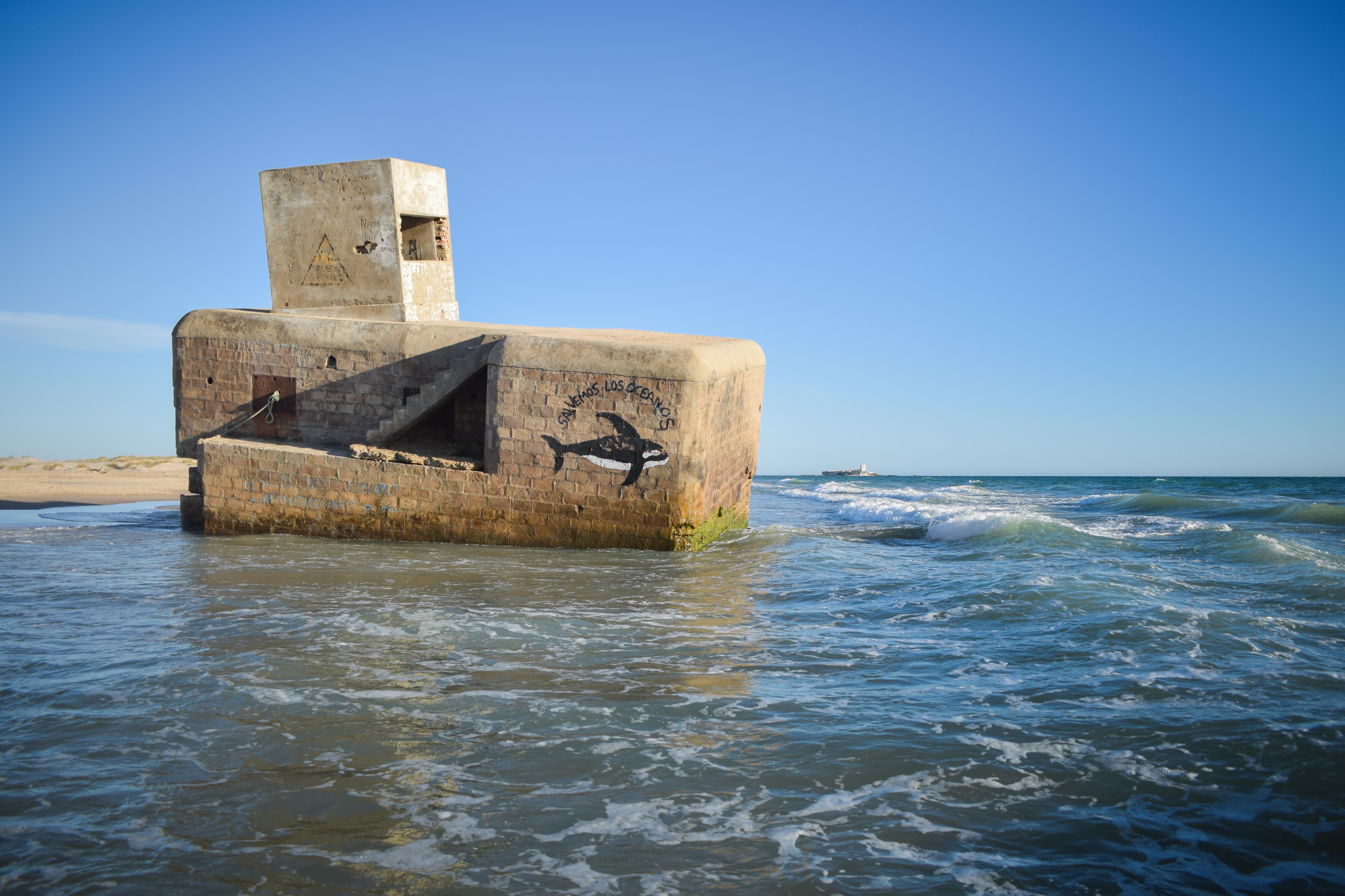 La opción que queda para no pasar por el trago de verse rodeado de perros si uno no quiere perderse esta orilla del caño Sancti Petri que da significado al sobrenombre de La Isla de León es hacer el sendero que se encuentra tras las dunas que dan la bienvenida a la playa. Precisamente, antes de llegar al límite de la playa y de la ciudad, se observan dos búnkeres de la Guerra Civil. Uno de ellos se presta más a las fotos que otro. En los 90 fue pintado por ecologistas para reivindicar el cuidado del medio ambiente. El dibujo de una ballena lo preside.