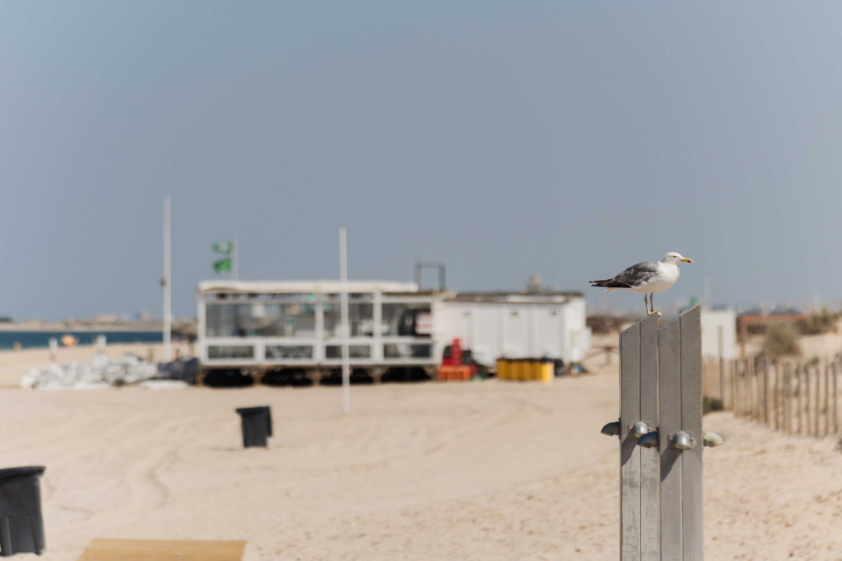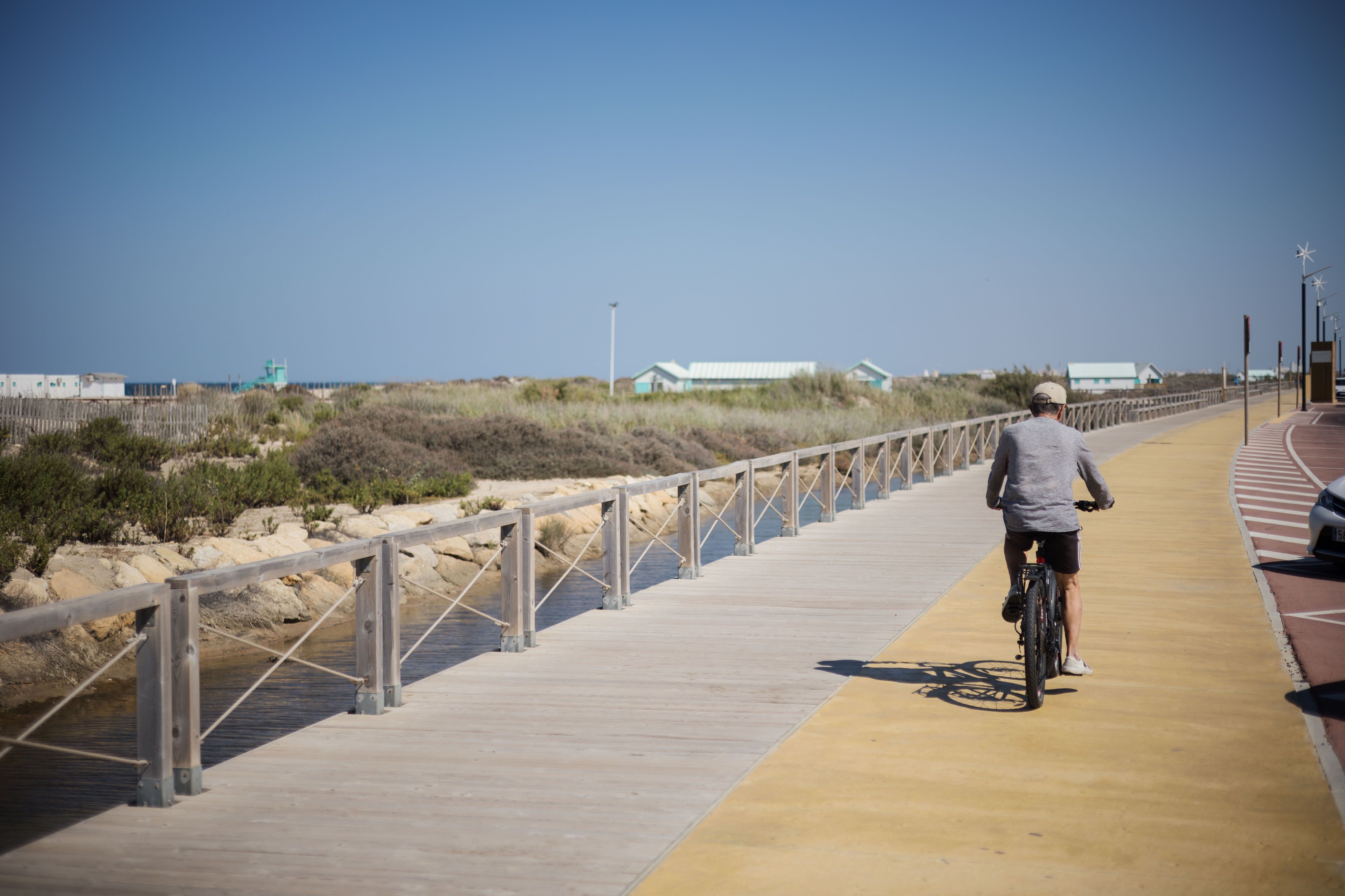 Es una mañana de levante como otras muchas. Aquí no pega demasiado, pero, de momento, no hay mucho ambiente en la playa. Los accesos están renovados y el color mint se ha adueñado de cada una de las casetas que hay ara ducharse o cambiarse. También las torres de los socorristas se ven a lo lejos pintadas de este color. Fuera, un paseo marítimo en pleno parque natural. Aquí no existen los edificios, sólo hay playa y marisma.