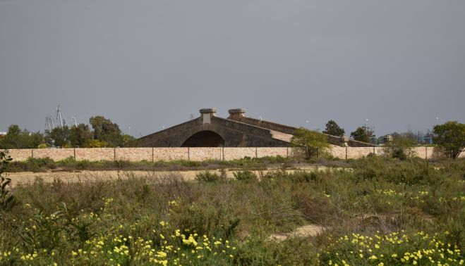 Unos metros más adelante, una vez que terminan de pasar los coches que vienen del astillero isleño, encuentro otro monumento, más antiguo, pero igual de mal cuidado. Al fondo, se ve el Puente Marqués de Ureña. A unos metros, más montañas de escombros. En su entorno, matorrales, ramas y más rastrojos. También hay mucho fango. Bajo el puente lo que no queda es agua. Se ha secado.
