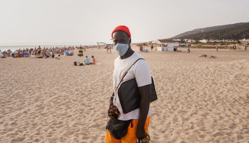 Muy cerca, pero a pie de arena, Pape Sow, senegalés, muestra a los turistas su escaparate, el que lleva encima. Algunos colgantes, y una colección de pulseras metidas dentro de una especie de carpeta achivador que cierra con cremallera, no muy distinta de las joyerías. Este año ganan las pulseras con la bandera de España, aunque les siguen de cerca las pulseras de la blanca y verde. Es el segundo año que viene. El año pasado, la gente, gastaba más. El resto del año trabaja en temporadas en el campo, como en la aceituna. Viene desde Puerto Real cada día para vender por la playa, apurando muchas horas al sol. "Ahora tengo papeles y quiero trabajar en el pescado", dice. En Sevilla compra el material que luego vende entre sombrillas. ¿El precio? Fluctuante. "Algunos quieren comprarlas por tres euros, pero no, a tres euros, no".