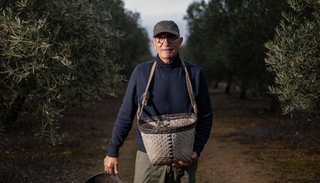 A las seis de la mañana ya está despierto. Desayuna, escribe algo en sus redes sociales —un ritual que rara vez traiciona— y se cuelga del cuello el macaco. Así se llama el cesto de mimbre que utiliza para ir depositando las aceitunas que recoge a toda velocidad. El suyo, de fabricación artesanal, tiene cintas cruzadas, para que no sufra la espalda.