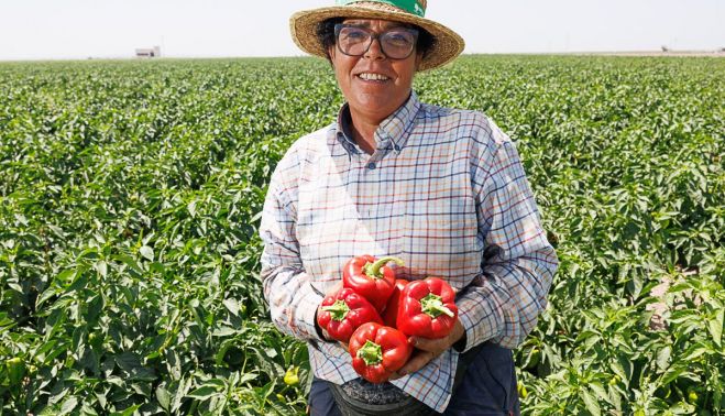 Mientras se agacha para recoger unos pimientos enormes, verdes y rojos a partes iguales, se queja de que hay algunos a los que ya les ha dado más sol de la cuenta, pero no del precio al que ya los tiene contratados con el comprador: “A 40 céntimos el kilo”, sentencia, y hace un gesto de resignación mientras se sube las gafas, sin perder una sonrisa que la rejuvenece por debajo del polvo, del sudor y del sombrero. “Es lo que hay”. Lo dice porque sabe, como todo el mundo, que el precio del pimiento en el supermercado ronda los tres euros. “Los que tengo en la otra parcela no sé a cómo me los pagarán, porque van a subasta, pero si me dan 50 céntimos les hago la ola”, dice, y Estos son de los que se asan”, explica mientras los frota contra su propia ropa descolorida y granulosa para ponerlos lustrosos. De las 14.000 hectáreas que conforman el Sector B-XII, 700 se dedican estos meses al pimiento, lo que supone, solo en recolección, 18.000 jornales. Eso sin contar puestos de trabajo como camioneros, tractoristas y la manufactura en fábrica.