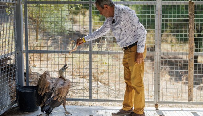 El último ha sido rescatar 26 buitres leonados en solitario, sin ayuda, este verano. "El primero lo cogí el 14 de julio y el último, el 7 de septiembre", detalla mientras da de comer en la amplia jaula, más grande que muchas habitaciones urbanas en estos tiempos, al último ejemplar que espera transporte.