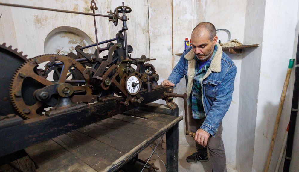 “Es todo mecánica”, exclama antes de subir al campanario. Son las 18.22 horas, pero confiesa que él lo ha marcado a las 18.25 porque tiene cierto retraso por el material del péndulo. En el punto más alto, frente a sus ojos, se dibuja una magnífica panorámica de su ciudad.