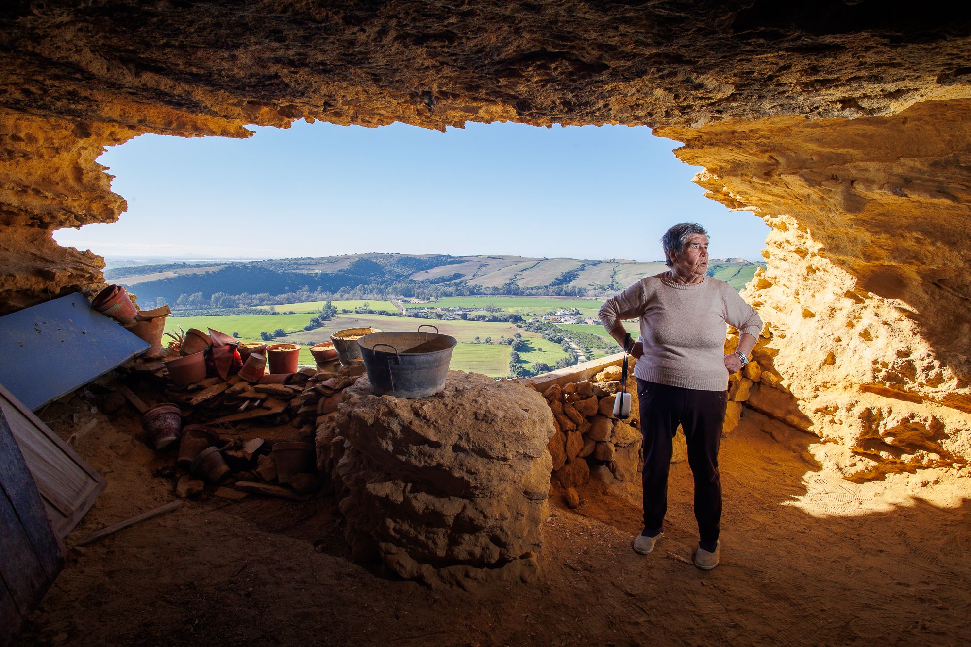 La experiencia de asomarse a la cueva que Encarna tiene en la finca donde vive, que comparte con otros dos vecinos, no es apta para personas que padecen vértigo, uno de los síntomas de la acrofobia, el miedo a las alturas. En un día soleado, se divisa justo abajo la caída de la Peña, la carretera que rodea al pueblo, y la campiña, con la Sierra al fondo.
