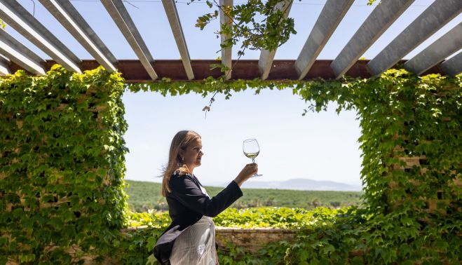 Cuenta Marta Toribio, responsable de enoturismo y visitas en la bodega, que las visitas se dividen en tres tipos: visitas con cata; visitas con cata y aperitivo; y visitas con cata, aperitivo y almuerzo. Solo el placer del recorrido por el viñedo y la incursión hasta la torre vigía ya hacen que la propuesta valga la pena, pero al llegar a la bodega, obra del arquitecto Alberto Ballarín, una espectacular terraza con vistas a los pagos sirve de escenario para catar los frutos de la cosecha. De septiembre a junio, siempre bajo reserva previa, es la época ideal para vivir la experiencia, que puede reservarse pinchando aquí. "La gente alucina, es algo muy especial brindar aquí, conocer el recorrido que va de la albariza hasta esta copa sin salir de aquí", relata.
