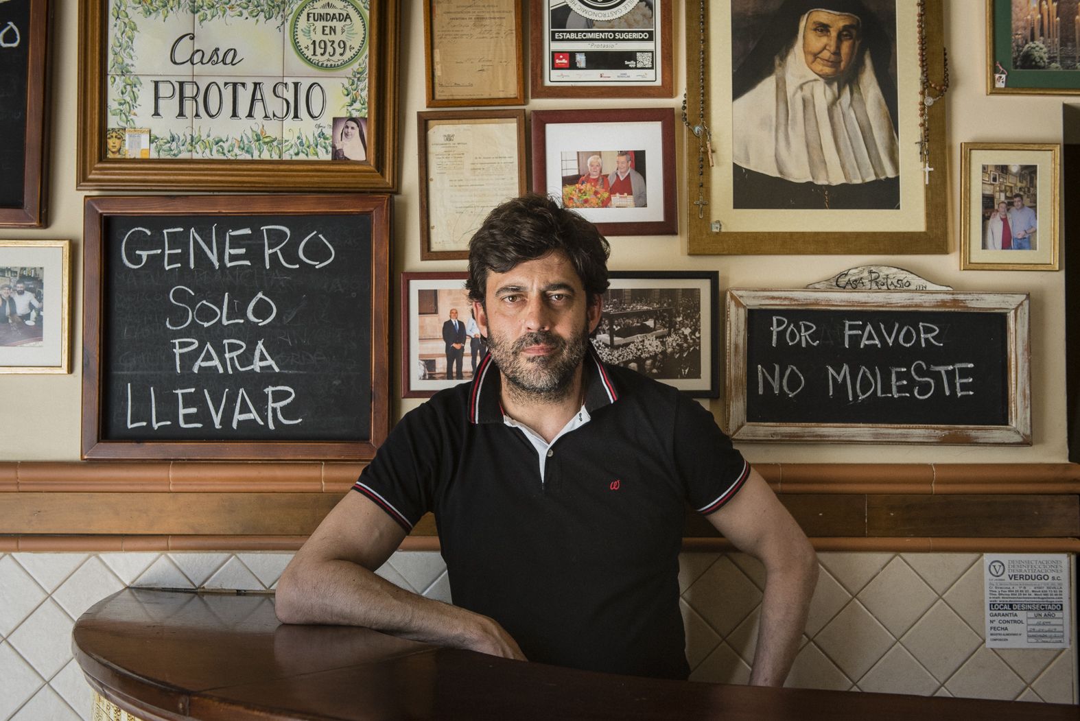 La historia de Casa Protasio se remonta al abuelo, Protasio Verdugo, a quien un íntimo amigo, Antonio Castilla, le confía el local tras acabar en la cárcel durante la Guerra Civil. Desde siempre fue despacho de vinos y licores, donde únicamente se vendían vinos del Aljarafe y de Manzanilla (del pueblo de Huelva, no la de Sanlúcar), coñac y aguardiante, además de algunos productos a granel como aceite o sobrasada. Así lo mantiene Protasio cuando lo adquiere en el año 34, lo funda en el 39, en el 52 lo convierte en bar y en el 70 mete las tapas. Protasio, segoviano de nacimiento, era agente comercial de alimentación, en una época en la que productos como la achicoria, sucedáneo del café, tenían gran popularidad. También trabajó en una fábrica de telas y en un taller de ebanistería, hasta que finalmente se queda con el local, compaginándolo con sus otros oficios. Manolo Pérez, el tío del cantaor Pepe Peregil, fue quien le servía los vinos en los primeros años, en unos tiempos en los que nadie bebía cerveza ni tinto.