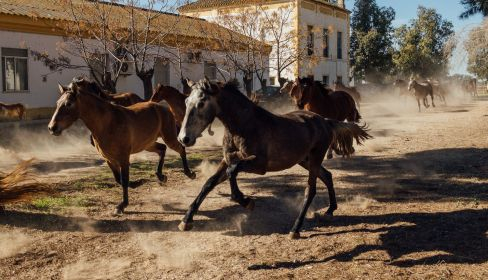 La brisa mañanera mece la crin de varios potros y sementales. Al galope, trabajan enganchados o montados, mejoran sus habilidades bajo la atenta mirada de los jinetes. “Sois los altos caballos inmortales, hijos del sol y espumas musicales”, recitaría Rafael Alberti si se detuviera ante los equinos andaluces a los que dedicó sus versos.