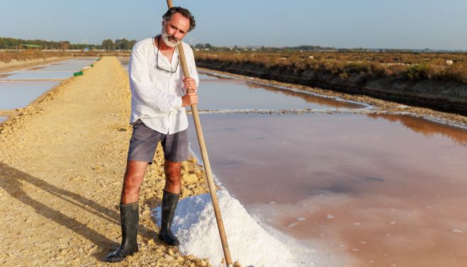 Un paseo por la salina tras unos días de levante es suficiente para captar el entusiasmo de este sevillano por un oficio tradicional que ha aprendido, también, de los portugueses, “que están adelantados” y por el que se está movilizando.
