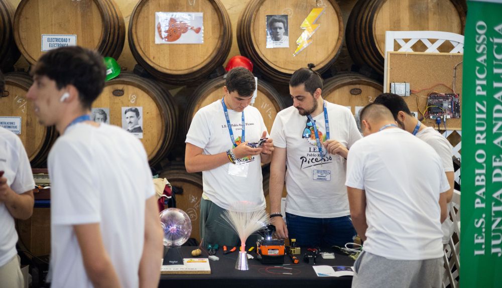 Una chica maquilla una cara mientras otra explica cómo funciona el cuadro eléctrico del frigorífico a un grupo de personas. La mayoría, son jóvenes con un futuro por delante que, desde este martes, muestran cómo se forman para hacer frente al mundo laboral. En las Bodegas Vélez, Chiclana celebra su I Feria de Formación y Empleo hasta este jueves 25 de abril. En las históricas instalaciones, estudiantes de FP, grados medios y superiores, junto a sus profesores, dan a conocer la oferta existente en la escuela pública.