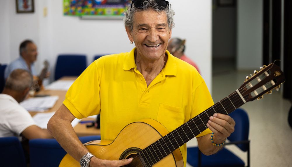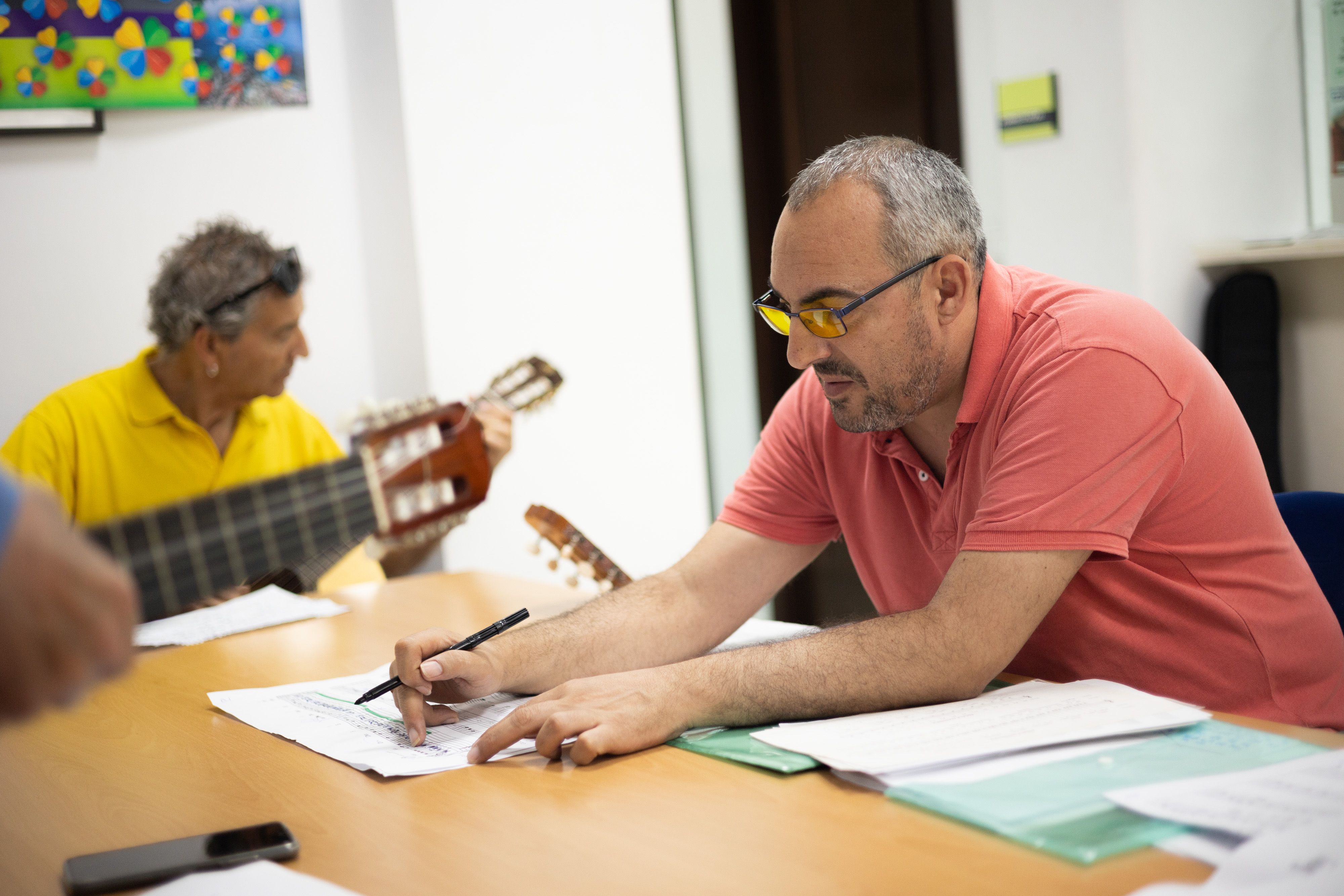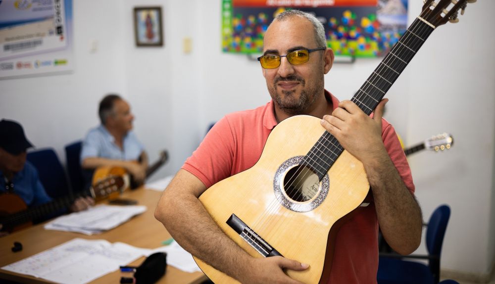 No ha sido hasta que se ha jubilado, tras haber trabajado en supermercados o con una empresa de distribución de pan, cuando ha podido implicarse. “Me cuesta porque la visión es poquita, pero la guitarra es muy bonita y vamos aprendiendo”, dice Antonio que, hace diez años sufrió un desprendimiento de retina que le dejó con un 18% de visión.