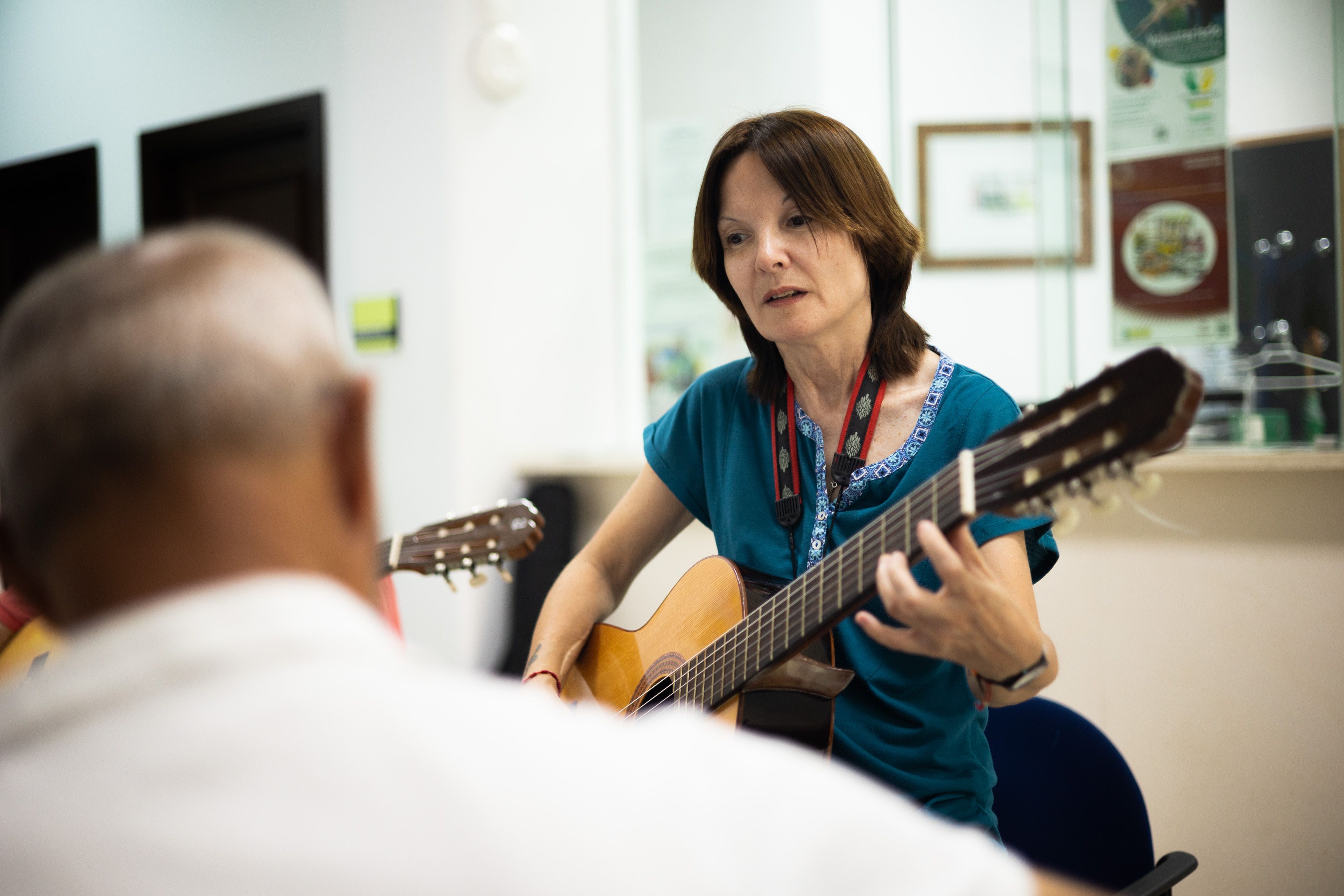Con su guitarra colgada del cuello, la maestra de los trastes atiende a los aprendices. En su currículum, ha dado clases tanto a niños con escasos recursos económicos como a adultos de 75 años y ha pasado por la Escuela de Música del Colegio San Felipe Neri o la Escuela Municipal de Música, en Úbeda.