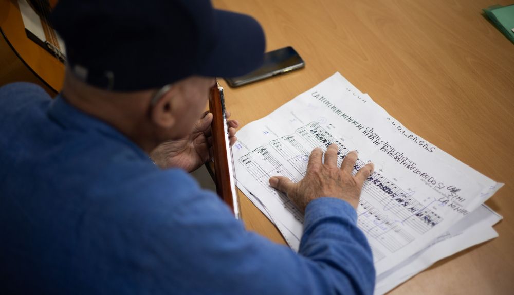 Con su polo amarillo “del Cádiz CF”, bromea, Manuel sigue las notas. Dice que es ahora cuando ha encontrado tiempo para una afición que ya había intentado probar en otras ocasiones. A su lado se encuentra Antonio Sánchez, chiclanero de 65 años que disfrutaba cuando tenía diez viendo a sus vecinos tocar la guitarra.