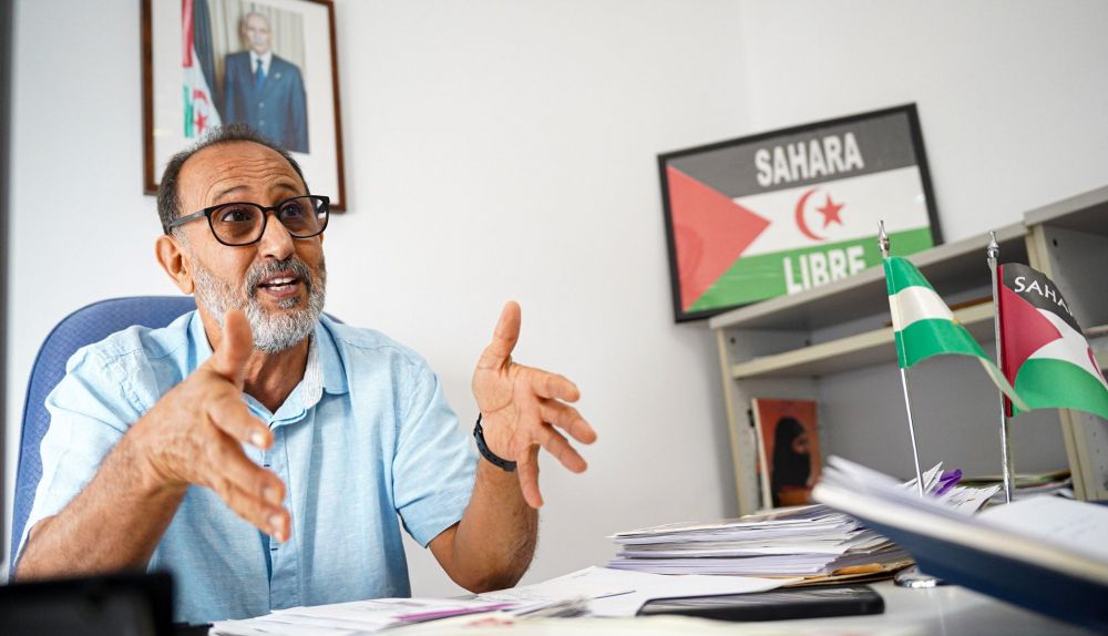 Desde su oficina, donde la protagonista es la bandera de su país, habla por miles de saharauis. "El Gobierno español no asume sus responsabilidades. Todo lo contrario. Facilita la ocupación de Marruecos y la reconoce", señala a lavozdelsur.es. Mohamed asegura que medio siglo después su pueblo sigue "resistiendo contra el ocupante para regresar a su tierra. Vamos a seguir luchando porque es nuestro derecho y el derecho internacional nos asiste, a pesar de que el derecho internacional sea ahora mismo un cero a la izquierda".