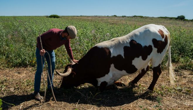 Con una vara y una cuerda en las manos, Ignacio Pérez, de 28 años, abre la puerta que da acceso a una finca, a pocos kilómetros de Medina Sidonia, donde tiene a sus bueyes, junto a otros cuantos animales. "Las vacas van a extrañar”, dice al entrar. "Os vais para el vallado del fondo y ahora os acerco a alguno", advierte. Y así lo hace. Como si se tratara de una mascota dócil, vuelve con Revoltillo, el jefe de la manada, que obedece a las órdenes que le impone.