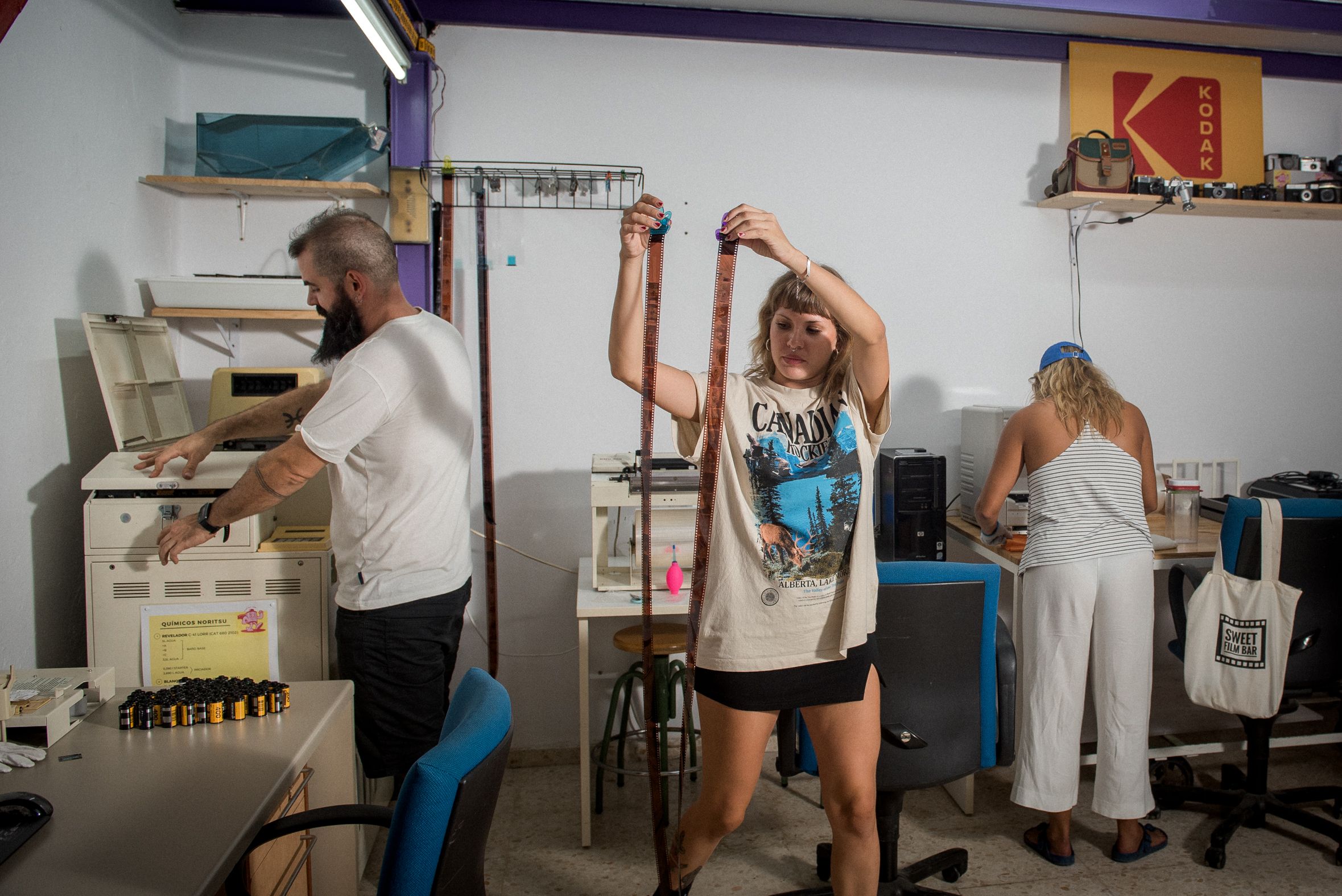 Darle un segundo uso a la máquina hizo que estuvieran antes que el resto. "No sabíamos hacia dónde iba la foto analógica, era algo personal", dice Raquel sobre el momento en el que todo empezó a crecer. "Hemos tenido la suerte de estar en el momento justo". El proceso del revelado sigue siendo un proceso químico que no ha cambiado en todos estos años y consiste en sacar la película de un chasis metálico y procesarla a través de diferentes sustancias. Las películas, de hecho, no han cambiado y cada día reciben de los años 70 u 80.