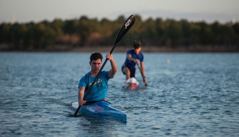 Manuel Raposo, hijo de riacheros de Trebujena, trae desde la localidad vecina a sus dos hijos, Hugo y Martina, y a su sobrino Diego. “Su niño acaba de proclamarse campeón de Andalucía en su edad”, informa Ruiz, mientras los chicos recogen sus palas y colocan la piragua en su sitio, entre otras muchas que conforman un ordenado y colorido conjunto bajo las casetas del club, a la orilla del lago. Las piraguas y las canoas tienen una envergadura considerable, pero no pesan mucho más de 10 kilos y entre dos chicos las manejan perfectamente. Cuando Hugo y Diego han terminado de colocar las suyas y se han colgado las palas enfundadas a sus espaldas, salen con otras embarcaciones chicos algo mayores. Se llaman Yerai y Guillermo, y a ambos se les nota la experiencia en club y en estas aguas por la forma con que cargan con sus aparejos, por cómo entran descalzos por la orilla de verdoso limo, por la forma en que echan la canoa y la piragua al agua, por cómo avanzan a golpe de pala, uno sentado en la piragua y el otro con su rodilla izquierda clavada en la canoa.