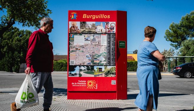 Las casas blancas y bajas ante un día caluroso de mayo podrían ser las de un pueblo cualquiera de la provincia de Sevilla. Las calles están engalanadas para la salida de una procesión. Los carteles y los azulejos que cuelgan de las fachadas y los balcones muestran que este es otro de los municipios que se entrega a sus devociones. Además, como tantos otros, homenajea a sus héroes en la pandemia. En este caso, a pocos metros del ayuntamiento existe una placa en el que todo el pueblo agradece a los agricultores su labor desinteresada durante la pandemia para desinfectar las calles de la localidad.