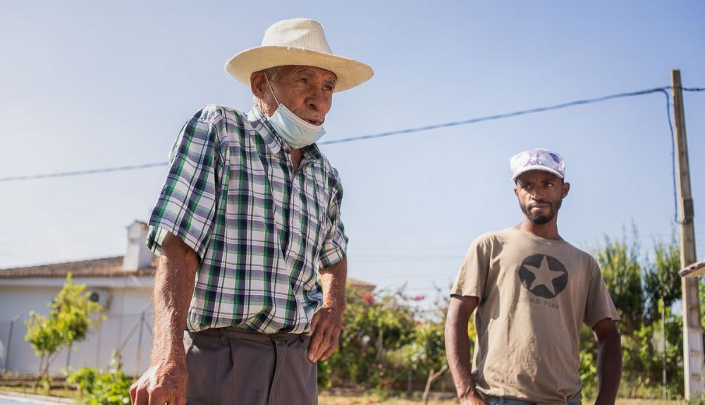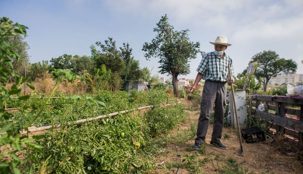 Alguna de esa gente buena que a veces hace sonreír a Moussa es gente como Juan Mena Román, que va para 72 años y se asfixia al hablar. Ha vivido siempre en el Pago San José y ahora acude cada mañana a la parcela de Isoje para colaborar.