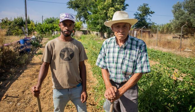 Su mirada lo dice todo. Juan, a unos metros de Moussa, ya ha empezado a recolectar tomates y se queja de que un bicho ha atacado a parte de la plantación. Ante la insistencia del fotógrafo, le llama: “Moussa, ven, que nos van a echar una foto”.