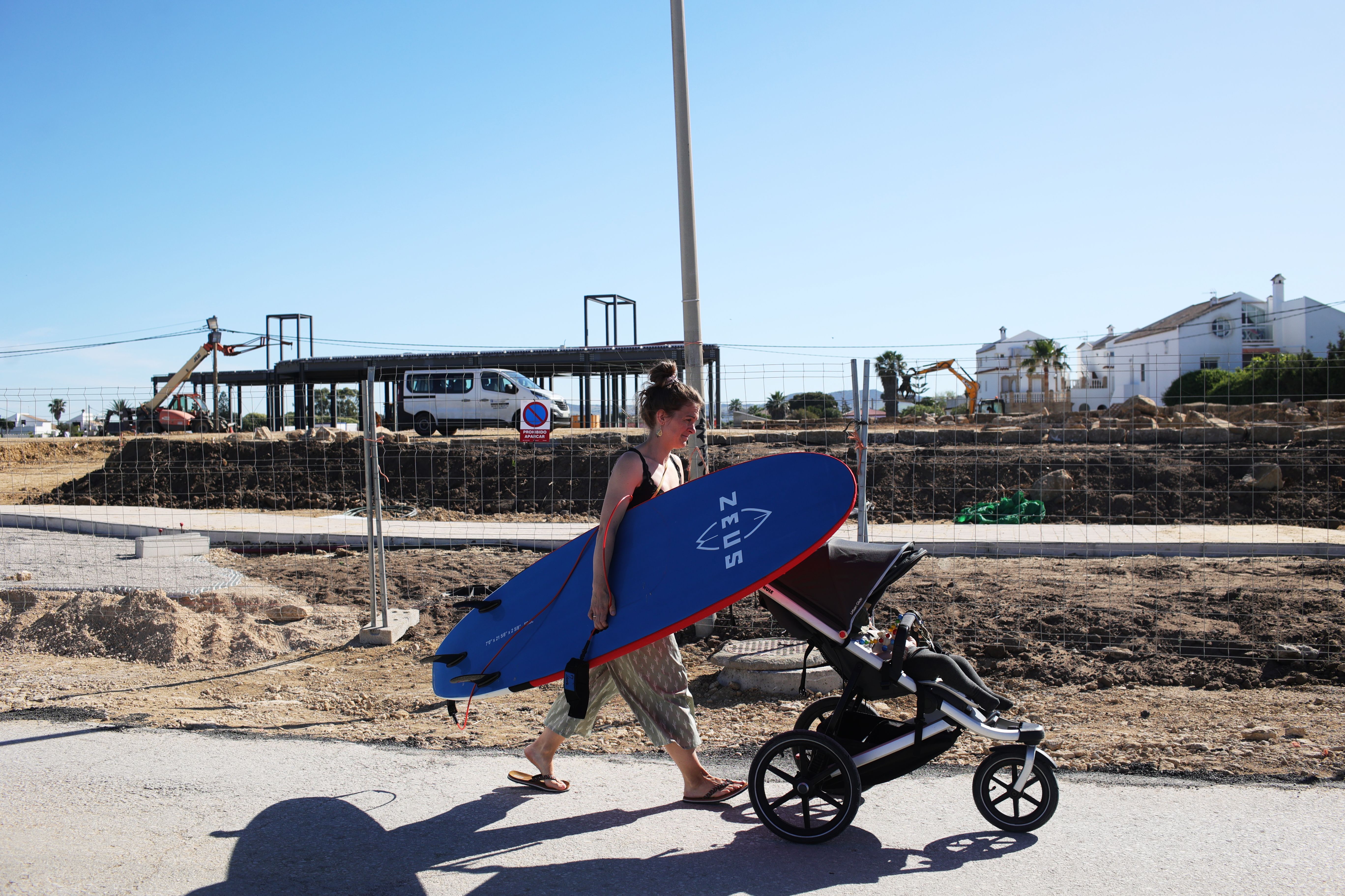 Por delante de la valla que rodea a la finca, en la que había un chalé construido legalmente —de los pocos en la zona—, porque era anterior a la Ley de Costas de 1988, pasean vecinos y bañistas que apenas prestan atención al desarrollo de la obra. Al ser preguntados, hay división de opiniones. “Es una barbaridad”, comenta una madrileña que reside en El Palmar gran parte del año desde hace dos décadas. Otros no opinan, quieren verlo terminado.