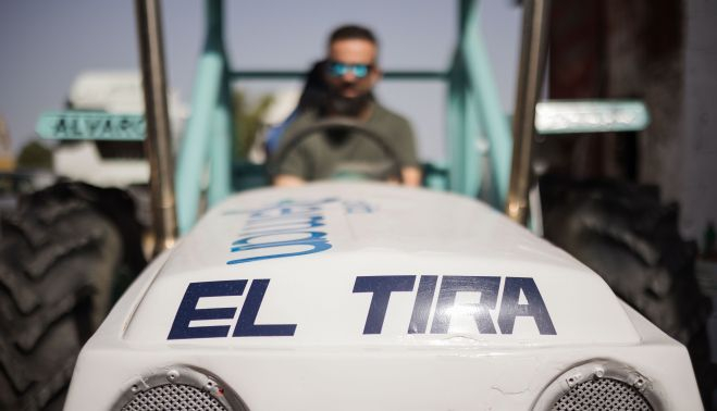 En el morro del tractor de José, de color blanco y detalles azul verdoso, se puede leer El tira, que es el apodo de su padre. “Mi abuelo tenía una yunta de mulo y él solo decía: tira, tira… y se le quedó”, explica. Encima de las ruedas pone Álvaro, el nombre de su hijo, y Ana, el de su sobrina. Y el suyo está en la visera —Villena, junto a una bandera de España—. El resto de la decoración la copan diversos patrocinadores, que hace unos años cubrían los gastos, pero ahora no llegan.