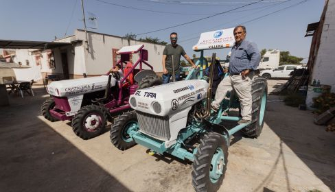 En el morro del tractor de José, de color blanco y detalles azul verdoso, se puede leer El tira, que es el apodo de su padre. “Mi abuelo tenía una yunta de mulo y él solo decía: tira, tira… y se le quedó”, explica. Encima de las ruedas pone Álvaro, el nombre de su hijo, y Ana, el de su sobrina. Y el suyo está en la visera —Villena, junto a una bandera de España—. El resto de la decoración la copan diversos patrocinadores, que hace unos años cubrían los gastos, pero ahora no llegan.