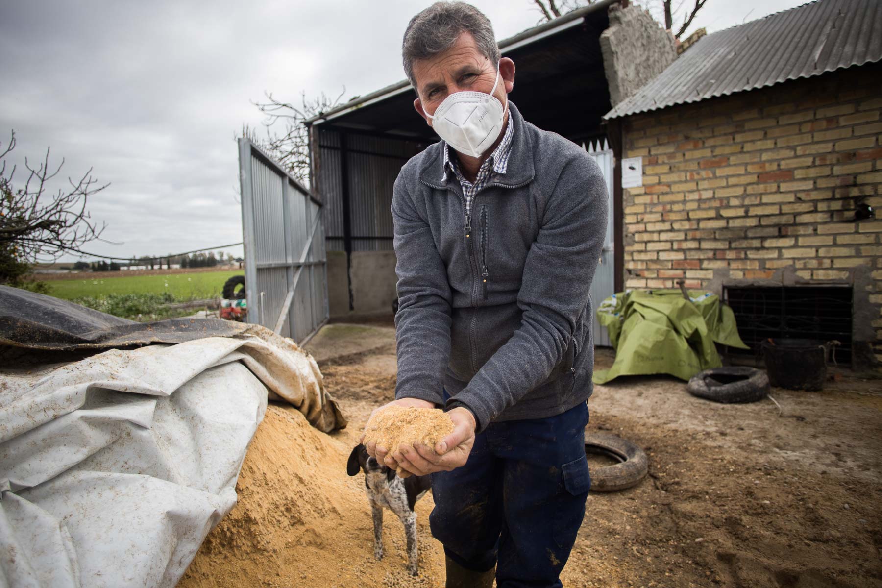 A lo lejos, antes de llegar, se vislumbra a las vacas, en un cercado dentro del que interactúan entre ellas, duermen y comen. Las más afortunadas, cogen sitio debajo del techo de chapa que hay en un extremo, junto a los restos de muro del antiguo cortijo que ocupaba estas tierras. Unas sacan la cabeza por el vallado para alcanzar las zanahorias que hay amontonadas junto a la entrada a la finca. Otras están tumbadas o, simplemente, andan un poco. José Antonio llega montado en un tractor. Polar gris, camisa a cuadros, pantalones oscuros y botas de agua, llenas de barro. Su outfit habitual. De hecho, pasa la mayor parte de su vida junto a sus vacas. Entre diez y doce horas diarias, calcula. Cuando no más.