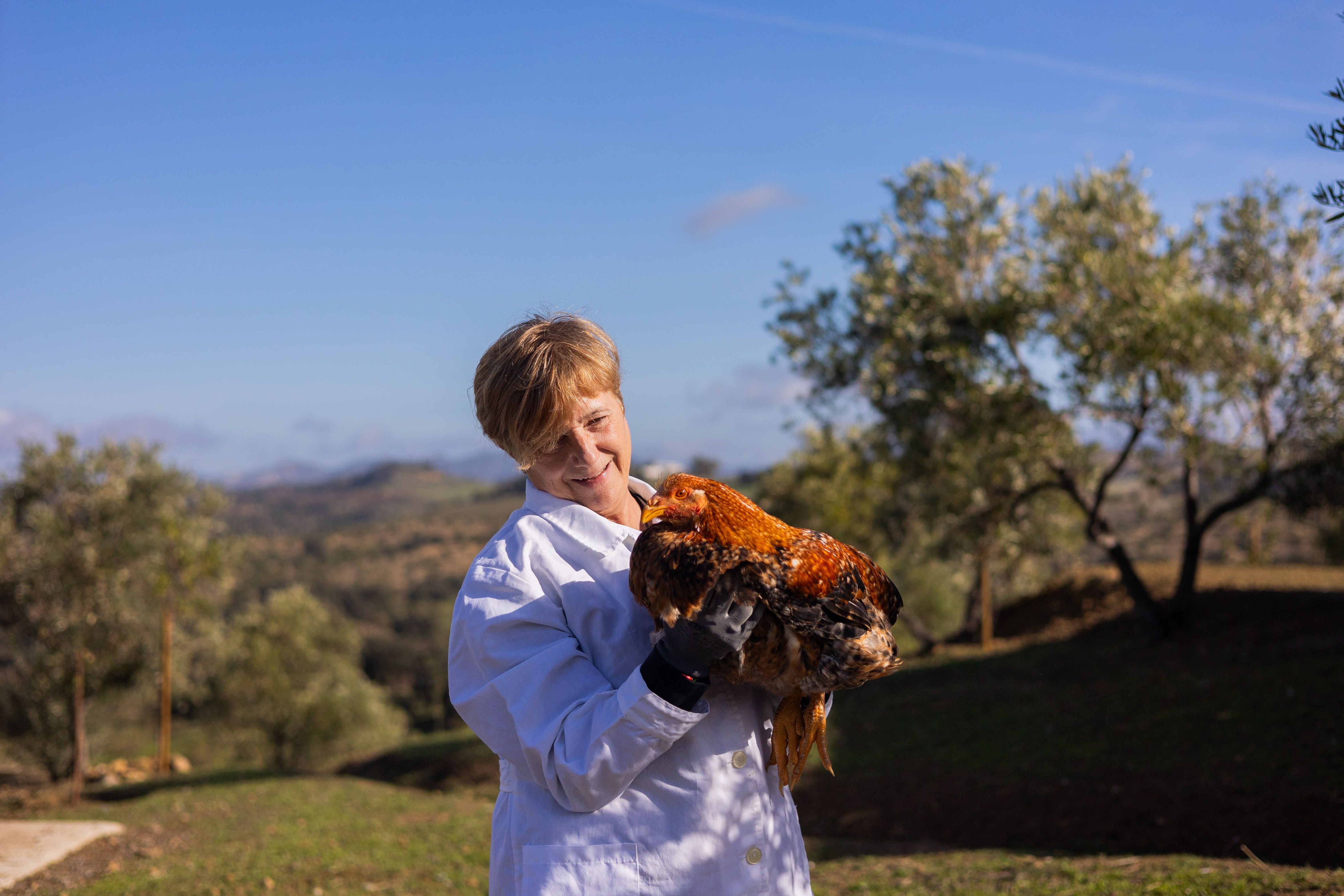 Antes de ese último momento, crecen en libertad en la finca serrana con 4,6 hectáreas, de las que dos están consagradas a las aves. Su alimentación es tan natural que la gerente les echa a diario aceitunas negras de los olivos de la zona. “Mira, mira”, avisa mientras los gallos gigantes acuden al lanzamiento. Las pelan con el pico en milésimas. Primero se comen la carne y luego, también, el hueso.