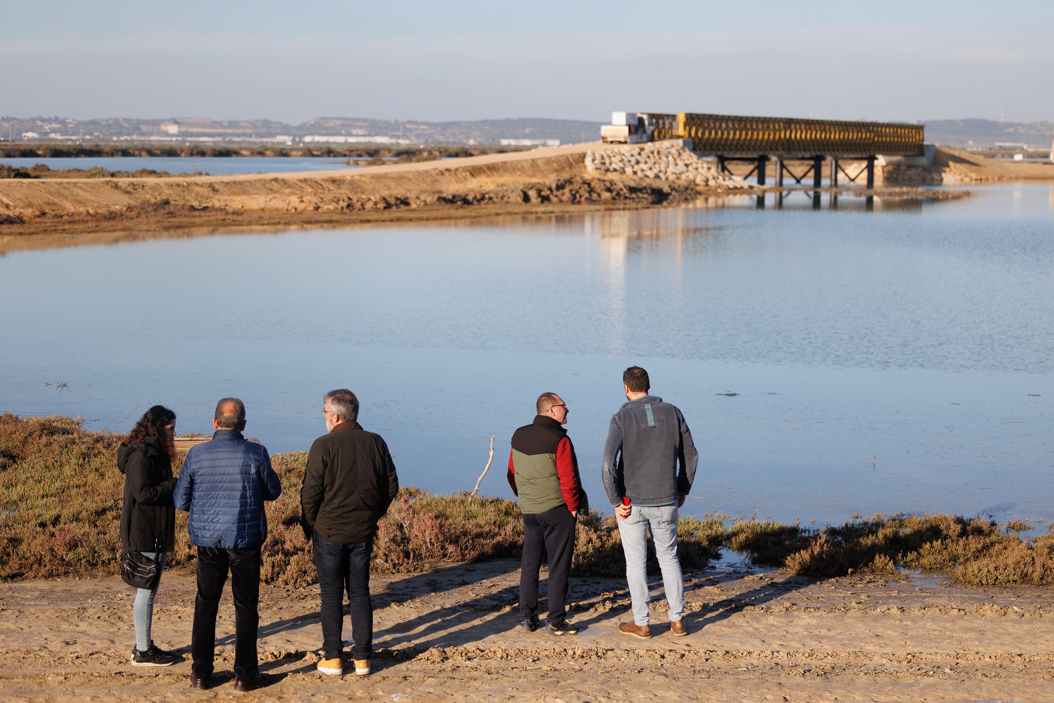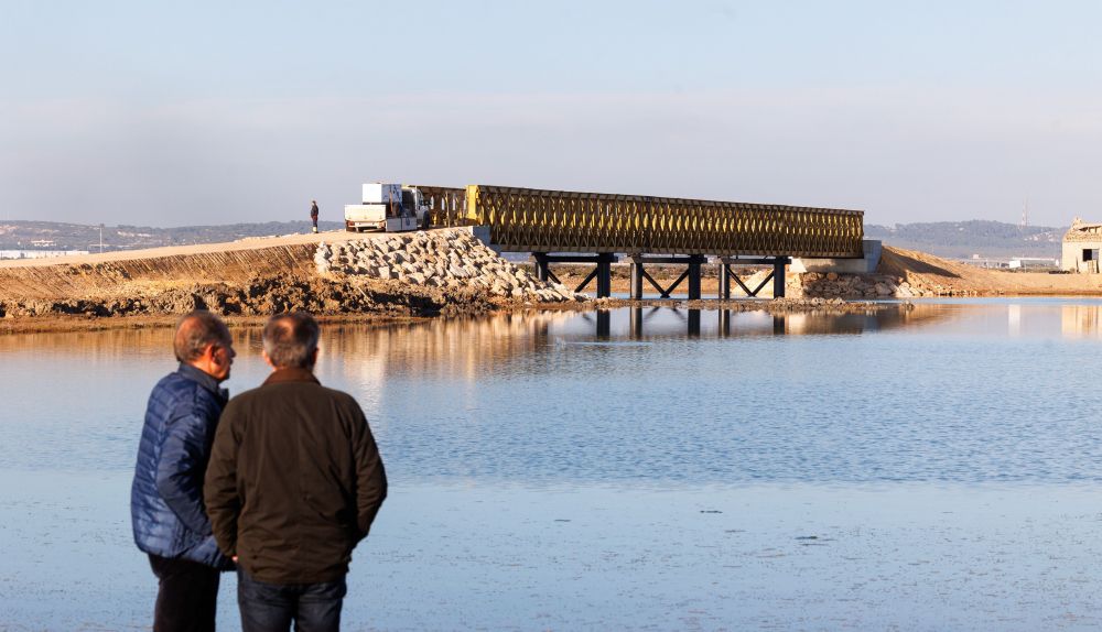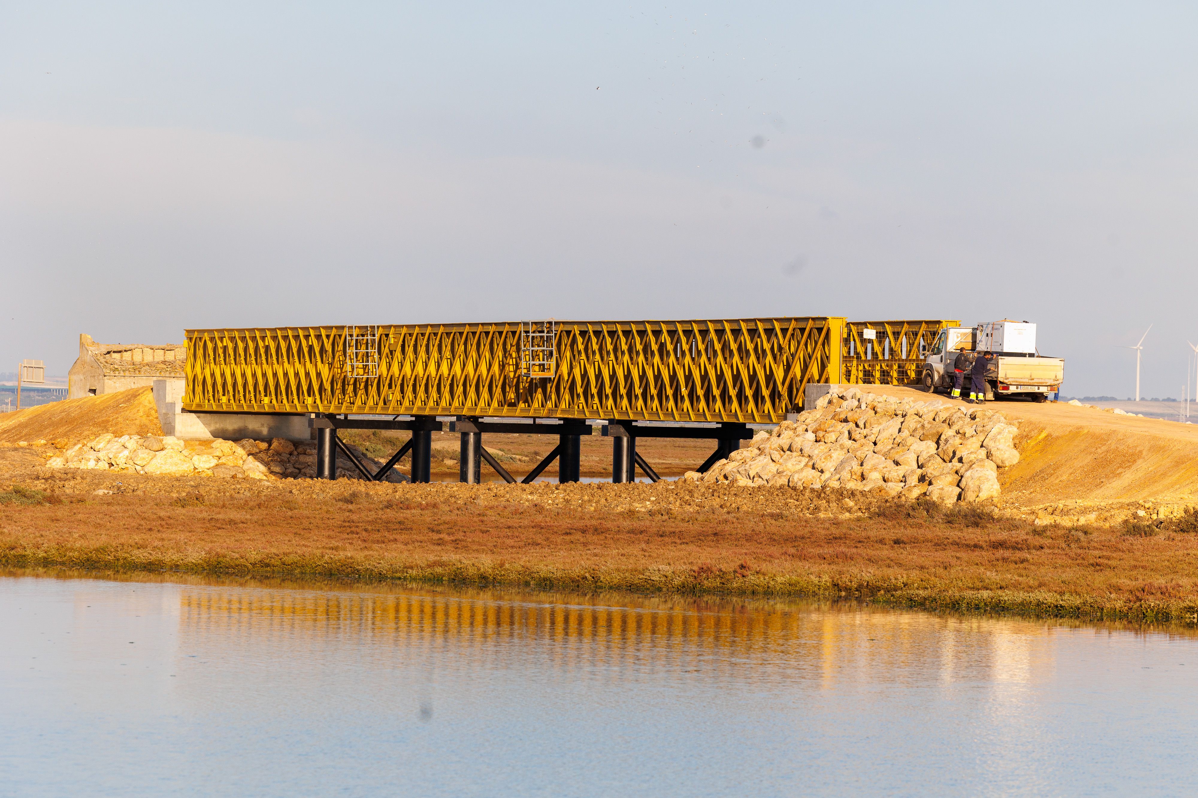 Al salir de El Puerto, desde la carretera, una nueva estructura de color amarilla salta a la vista. Reluciente bajo el sol, un puente resalta en medio del Parque Natural Bahía de Cádiz sobre uno de los brazos del río San Pedro. Varios operarios ultiman las obras de este tramo durante las últimas horas de luz del día. “Tiene una conservación extraordinaria”, dice Joaquín Paloma, de Ecologistas en Acción frente a esta parte de la ruta cicloturista y peatonal que pronto se inaugurará.