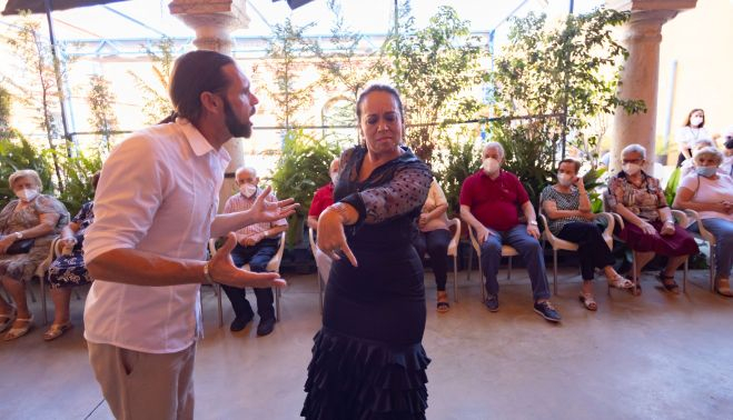 El cantaor continúa con temas de Manolo Caracol, La Paquera o Rocío Jurado, que no resultan extraños al grupo. “Les canto lo que he escuchado en un aparato de música, pero ellos los han vivido en su niñez. Que mejor manera de refrescar la memoria que con el flamenco”, dice.