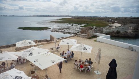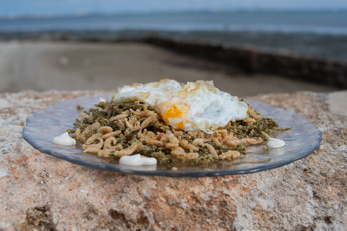 Los rayos de sol iluminan un plato de huevos con salicornia y camarones fritos. La cocina del restaurante dirigida por Carmen Doello ya está en marcha para “poner en valor el pescado de esteros”. Entre sus especialidades se encuentran ostras, camarones o langostinos “que hace un ratillo estaban vivos” y especies autóctonas fuera de carta extraídas del enclave.