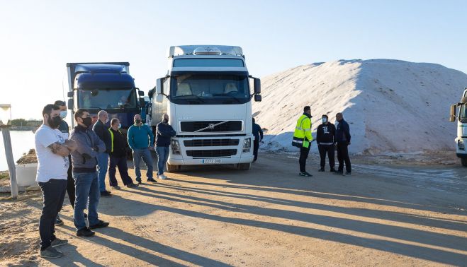 Algunos de ellos llevan desde las 10 de la mañana sin moverse de allí. “Llevamos aquí todo el día, el carril está todo reventado y no se puede ni pasar”, relata uno de los afectados que se ha bajado del camión y aguarda junto a otros compañeros de profesión en una esquina. La paciencia se les acaba frente a la odisea que supone cargar la sal. “Aquí pesan, te mandan allí, a la otra salina, a cargar, y tienes que volver aquí a pesar”, explican los que manifiestan el descontrol que se ha desatado. Cada camión debe tener todo en regla para poder partir y la llegada de vehículos no cesa.