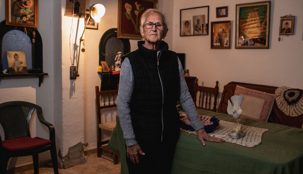 La casa da muestras de haberse entretenido con la misma tarea primorosa muchas otras tardes. Solamente al oscurecer llega su hijo, Francisco López (56 años), porque “no me gusta dejarla aquí sola y me la llevo a casa”, en Lebrija. “Si fuera por mí me quedaría aquí siempre, como hasta que se murió mi Juan”. Hasta el año 2015, el matrimonio —que contaba con varias parcelas de cultivo— seguía viviendo aquí, y desde entonces Ana se viene a diario, sin que le importe la soledad. Le hace compaña el pequeño televisor encendido e ignorado, testigo del mundo exterior, pero sobre todo una colección de santos en forma de cerámicas, pinturas o estampas que pueblan el saloncito donde hace vida Ana. “Yo nací en Los Palacios y me vine aquí con 12 años”, cuenta ella. “Apenas fui al colegio allí, y cuando llegué aquí yo ya era una mujercita que sabía hacerlo todo en la casa”.
