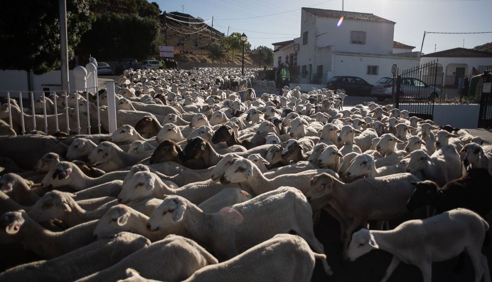 Este viernes partían de El Gastor 1.750 ovejas segureñas -algunas, merinas- con destino al término de Las Cabezas, pasando alrededor de las ocho de la mañana por la localidad Algodonales, en la Sierra de Grazalema, donde en una plaza les esperaba un abrevadero, el de la Fuente Alta. Eduardo Siles es uno de los miembros de la explotación, propiedad de su hermano. "Ahora hay poca comida por esta zona. Volverán aquí a finales de agosto", explicaba. Por eso, seis pastores iban acompañados de dos burros, un caballo, cuatro perros y tres cabras. Unos, para desplazarse por turnos ellos mismos. Otros, para ayudar a encauzar a las ovejas. Los perros evitan que se salgan de los caminos, y sin las cabras, "que son muy nobles", las ovejas no se reincorporan a la marcha. "Cada vez quedan menos personas porque es un oficio muy duro. Y cada vez son más controles de Sanidad, por temas como la lengua azul, pero parece que nos están permitiendo algo más últimamente".