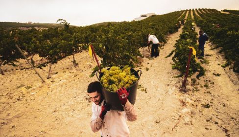 Son casi las siete de la mañana. El rocío empapa las hojas de las parras y la vid, húmeda como si una nube hubiera precipitado sobre ella, brilla entre la penumbra. Estamos casi a mitad de la jornada y ya se han recogido varios miles de kilos de uva.