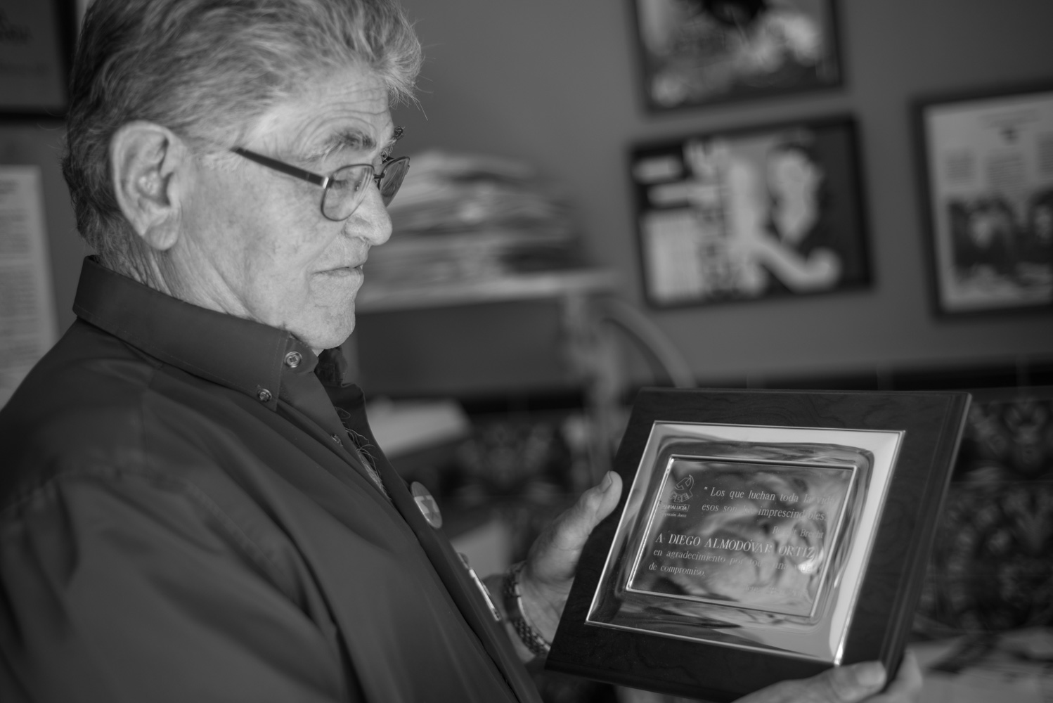 La puerta de su casa está abierta. En el recibidor, fotos del Che Guevara y Rafael Alberti. Para cuando se realiza la entrevista, a media mañana, Diego Almodóvar, a sus 79 años, ya ha estado dos horas en el gimnasio. “Hago 40 minutos en la cinta, luego otros 40 en los aparatos y media hora en la piscina”, cuenta. Se levanta a las cinco y media de la mañana. “Hago las faenas de mi casa y a las siete entro en el gimnasio”. Nunca ha bebido, dice que no le gusta y no fuma desde hace 45 años. ¿Es el secreto de su vitalidad? Puede ser. Hasta él mismo pierde la cuenta de los colectivos en los que participa. “No tengo dedos de la mano para contarlo”, dice. Es miembro de la Coordinadora del Agua, de la Coordinadora de la zona Sur Existe, presidente de la asociación de vecinos de El Portal, forma parte de la ejecutiva permanente del consejo local de mayores y milita en IU y en el PCE.