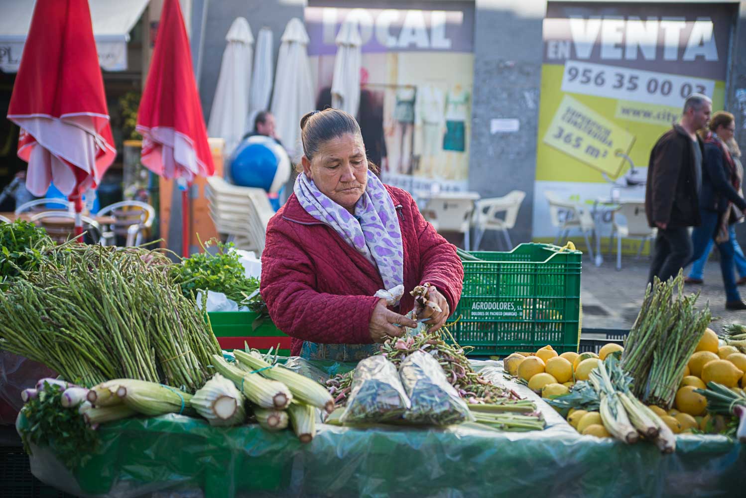 En plena Plaza, la familia Romero, envuelta entre cebollas, cabezas de ajo, limones y perejil, vocifera sus artículos especiales, de lujo. Venden espárragos y esos deliciosos cardillos que popularmente se cocinan, aludiendo a su hermano de temporada, como tagarninas esparragás. La recogida de esta hierba es para algunos, una afición en invierno, y para otros, un oficio como otro cualquiera. Juani y su marido se levantan cada lunes a las siete de la mañana para llegar al campo de Medina Sidonia a eso de las ocho y media. La faena de la mañana les puede llevar unas cinco horas. "Mi marido las recoge con una zoleta y luego las limpiamos mi hija y yo", explica. Suelen colocar la planta boca abajo y luego deslizan los dedos desde el tronco hasta las puntas. A día de hoy usan guantes, antes, como su madre Carmen La Coja —relata—, todos los trabajadores se ripiaban ambas manos arrancando tagarninas una a una.