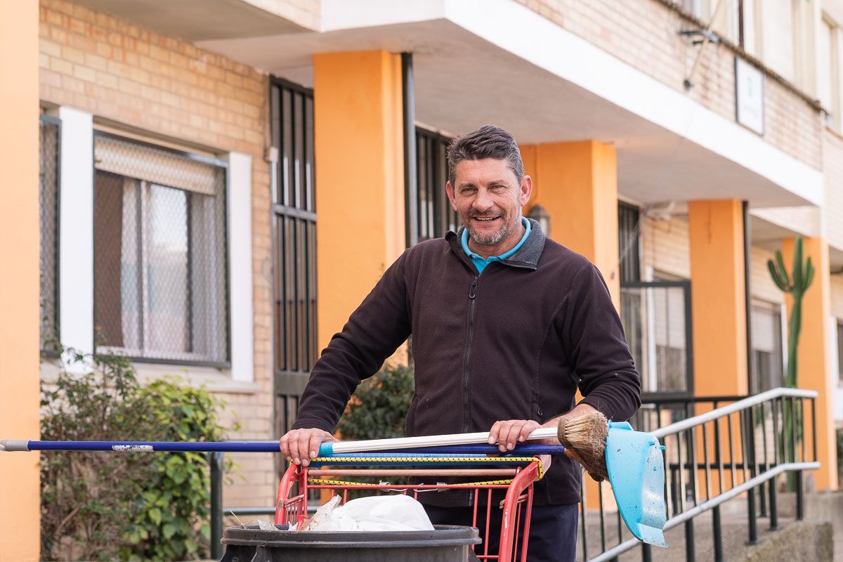 La primera función de Javier es abrir las puertas del colegio, a las nueve menos cuarto de la mañana. Insiste en que "jamás, jamás he llegado tarde, ni un solo día... He podido faltar a lo mejor por temas familiares, tema de males, pero muy poco". Después, se tiene que hacer cargo de todo lo relacionado con las instalaciones, que son su competencia, porque son competencia municipal. Limpia los patios, planta arbolitos con ayuda de los niños dentro de sus tareas académicas, está pendiente de que no queden restos de bocatas en el patio... No es vigilante, pero, a fin de cuentas, lo ve todo.