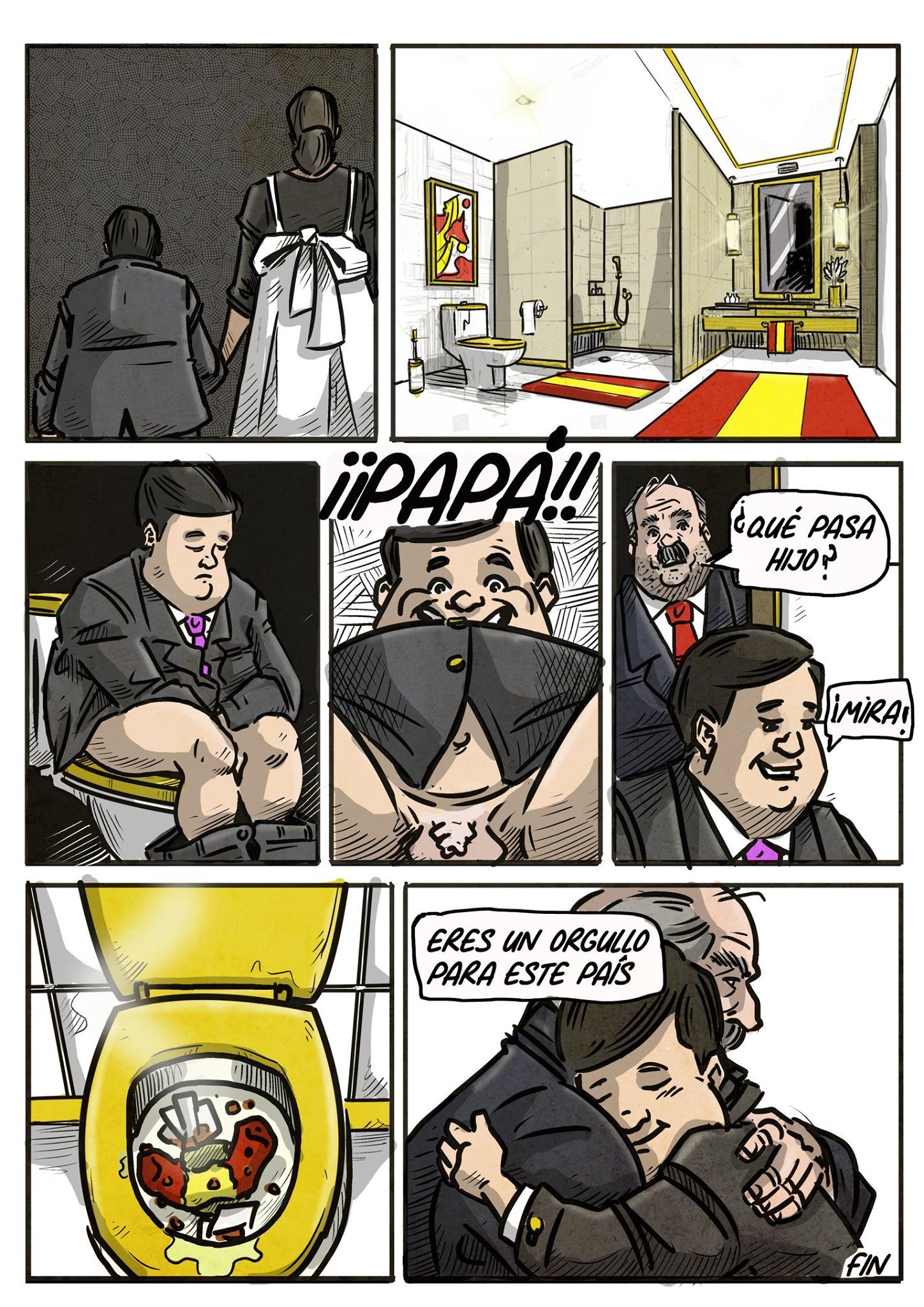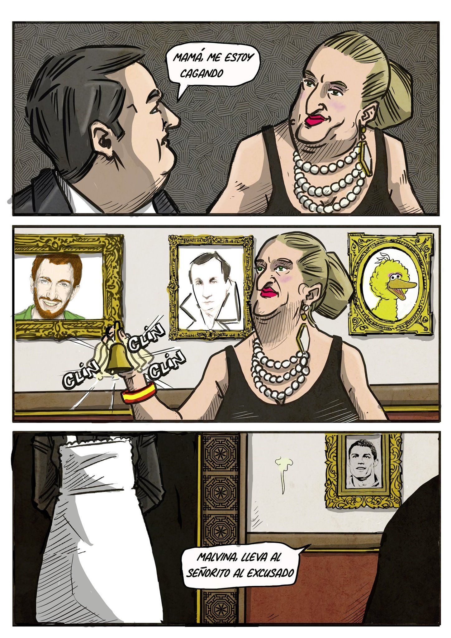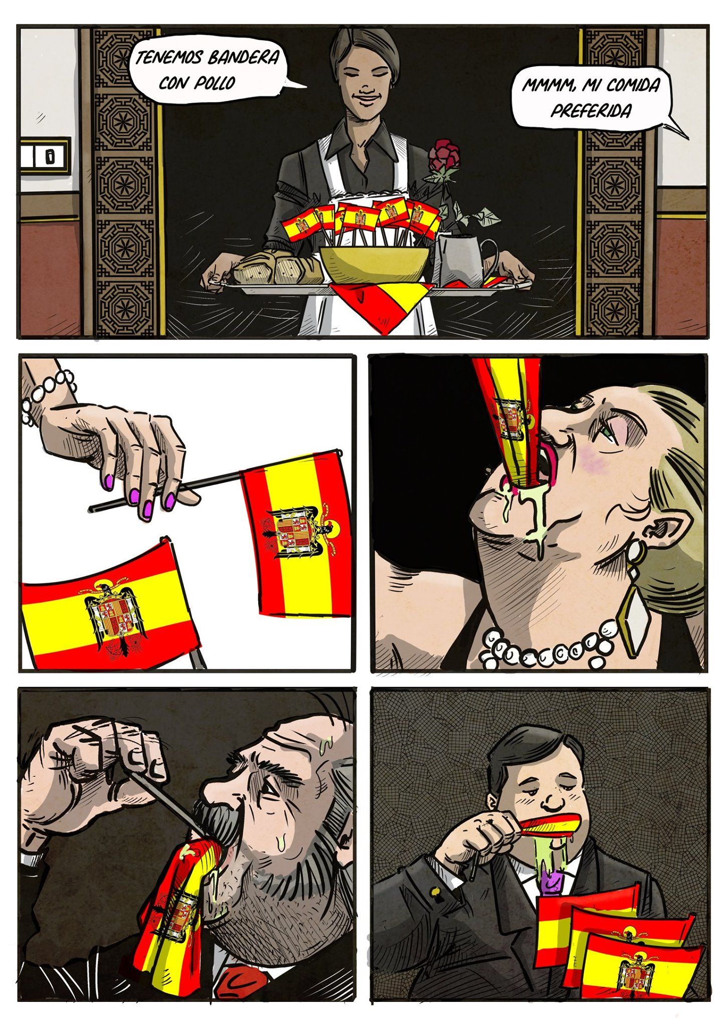 “Tenemos bandera con pollo”, dice la sirvienta mientras trae en una bandeja una rojigualda. “Mmmm, mi comida preferida”, dice el señorito. “Mamá, me estoy cagando”. El resto se define por sí mismo en su contenido gráfico: “Eres un orgullo para este país”, dice el padre de familia. Es una de las aventuras de Ricardo Garrido (Sevilla, 1979), un ilustrador que además de colaborar con la revista satírica TeVeo de Rafael Iglesias, hace historias como Made in Spain. “La gente me conoce en persona y no me relaciona con mis dibujos... creen que yo soy de otra forma”, dice por teléfono a Levantaos de lavozdelsur.es. El dibujante, oriundo del barrio de Triana y residente en la actualidad en Lucena, se reconoce como una persona tímida que se suele “llevar bien con todo el mundo”. “Visualmente tampoco soy muy punki, soy un tío normal y corriente”, bromea.