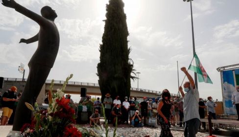 En la carretera de Carmona, el líder de Izquierda Unida en Andalucía, Toni Valero, alza su puño en un cara a cara con Blas Infante, inmortalizado con los brazos abiertos en una escultura que le recuerda. "El autogobierno es traicionado por el Gobierno andaluz. Fue un avance democratizador inconmensurable que llenaba de esperanza y prosperidad a Andalucía", dice en declaraciones a los medios. "Proteja al autogobierno, no lo maltrate; tiene que ser leal con la memoria de Blas Infante, no basta con poner solo unas flores", añade.