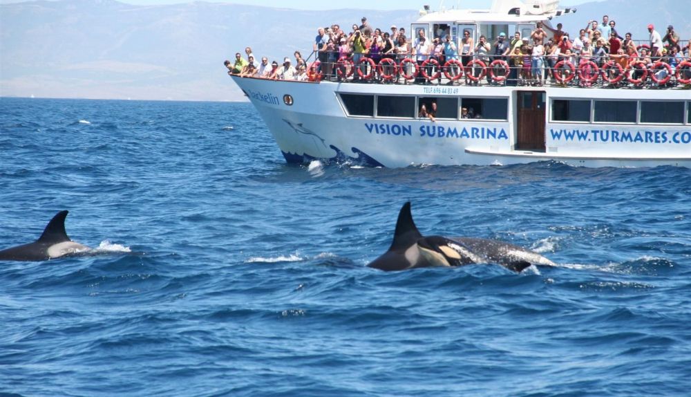 El avistamiento de cetáceos es uno de los atractivos con los que cuenta Tarifa en su oferta turística, siendo uno de los principales puntos de Europa para la observación de delfines y ballenas en libertad, pudiendo observarse hasta siete especies. Delfines comunes, listados y mulares; calderón común; cachalotes y rorcuales; así como la orca, que es el que más suele interesar a los visitantes; son las especies que interactúan con los pescadores del Estrecho.