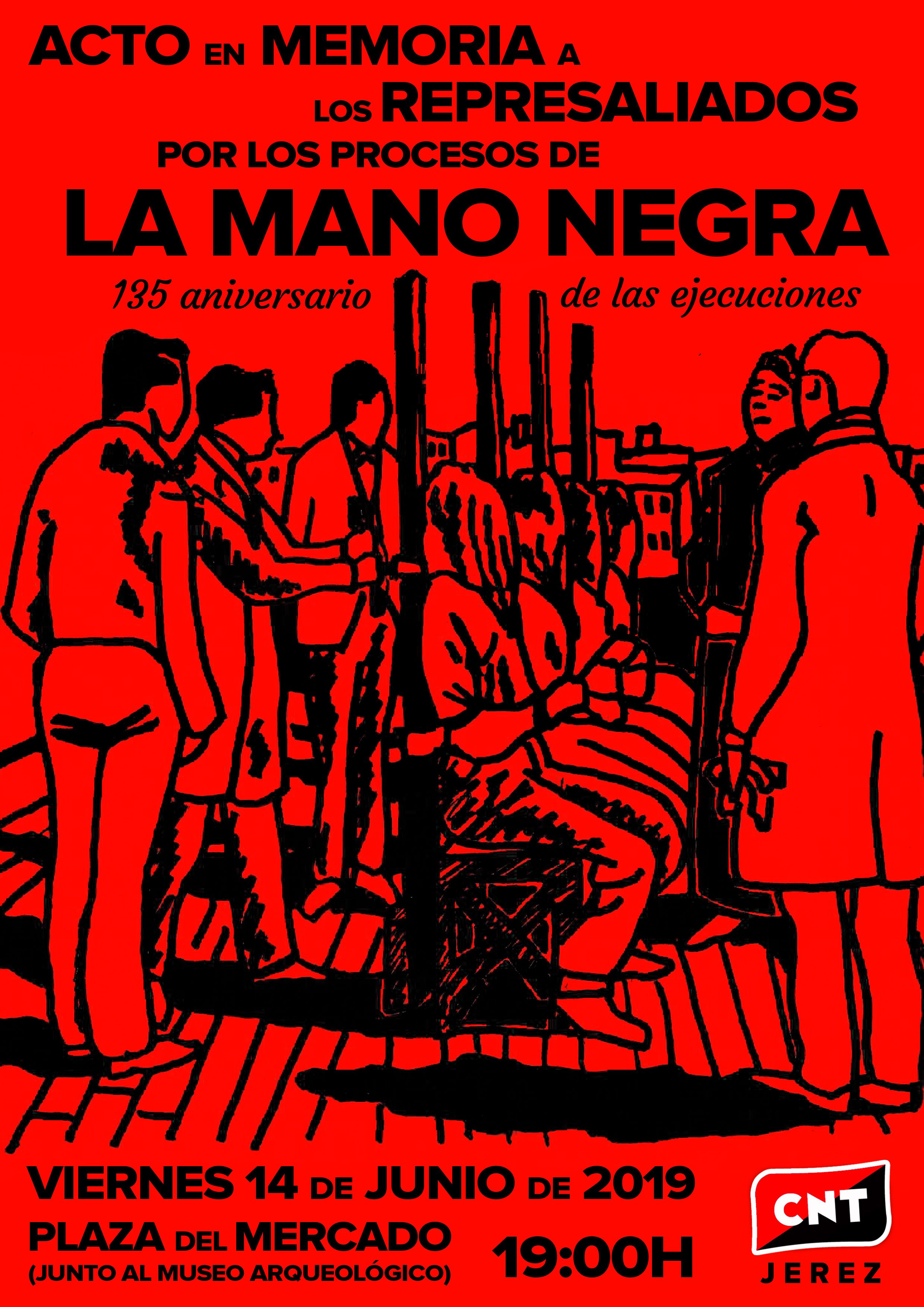ejecuciones por los procesos de La Mano Negra. Ese mismo día del año 1884 siete hombres fueron ejecutados a “garrote vil” en la Plaza del Mercado de Jerez, acusados de haber cometido una serie de asesinatos en distintos lugares del campo de la comarca. Los procesos se hicieron sin apenas garantías legales, y los acusados y detenidos eran en su mayoría militantes de la Federación de Trabajadores de la Región Española, la organización obrera peninsular que representaba a la Internacional (la A.I.T.) en nuestro contexto, y que en aquellos años estaba en auge.https://www.youtube.com/watch?v=oI-ZMr642hEEl Gobierno de esa época (Sagasta) se empeñó en identificar a una supuesta sociedad secreta, denominada la Mano Negra, con la Federación, y designó a un Juez especial que fue enviado a Jerez para esclarecer esos crímenes, con gran aplauso de la prensa, los grandes propietarios de tierra y la Iglesia Católica. En los procedimientos judiciales no faltaron las torturas ni los testimonios falsos. El resultado fue el de decenas de condenados a largas penas de prisión (9 de ellos fueron condenados a muerte, pero sus penas fueron conmutadas), y