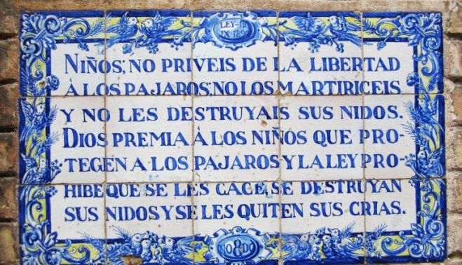 1) “Niños: No privéis de la libertad a los pájaros; no los martiricéis y no destruyáis sus nidos. Dios premia a los niños que protegen a los pájaros y la ley prohíbe que se les cace, se destruyan sus nidos y se les quiten sus crías”.