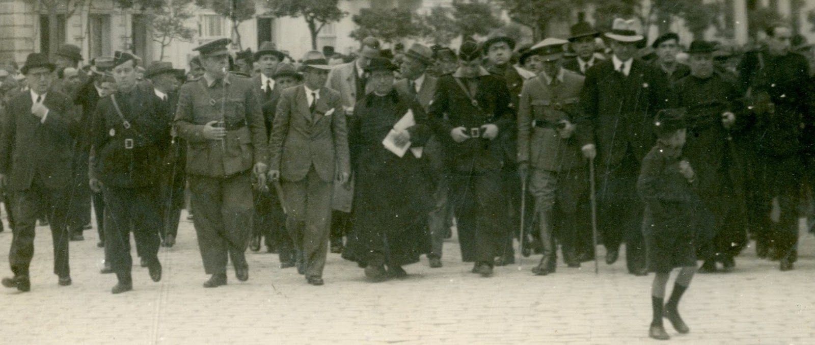 En la cabecera de la manifestación identificamos al abad Teodoro Molina al lado del que parece ser el que también fuera, de manera accidental, Jefe Provincial de Falange y posteriormente alcalde de Jerez (a su derecha), José Mora Figueroa Gómez-Imaz; el Comandante Militar golpista Salvador Arizón Mejía (a la derecha de este último); el alcalde franquista del momento Juan José del Junco (a la derecha de Arizón), un nuevo representante de la Iglesia de Jerez y otros jerarcas locales del nuevo régimen; siendo, probablemente, el segundo por la izquierda uniformado el propio Joaquín Bernal Vargas.
