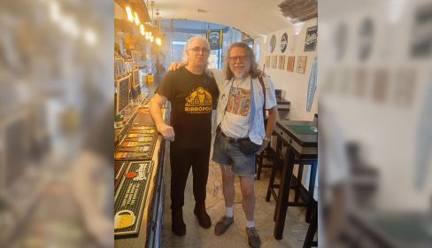 Pues bien, este es el mismo caso. Si echan un vistazo a la imagen que ilustra estas líneas, casi con toda seguridad cualquier persona que pare por el centro de Jerez reconocerá inmediatamente al camarero alto del pelo largo con coleta, Jimmy –Jimmy Rock cuando pincha música–, pero seguro que no acaba de dar con la tecla si le preguntamos por el señor, ya talludito, que posa a su lado y que, por cierto, se da un aire al artista jerezano Diego Carrasco. Jimmy, gran seguidor del hard rock, metal y (algo menos) del punk y rock alternativo, reparó en este señor inglés, cercano a los 80 años, que entró el domingo por la tarde en la cervecería Birrópolis acompañado de su pareja, y le preguntó si era o había sido músico, a lo que el tipo le respondió que, en efecto, era músico y que su nombre era Roger Glover.