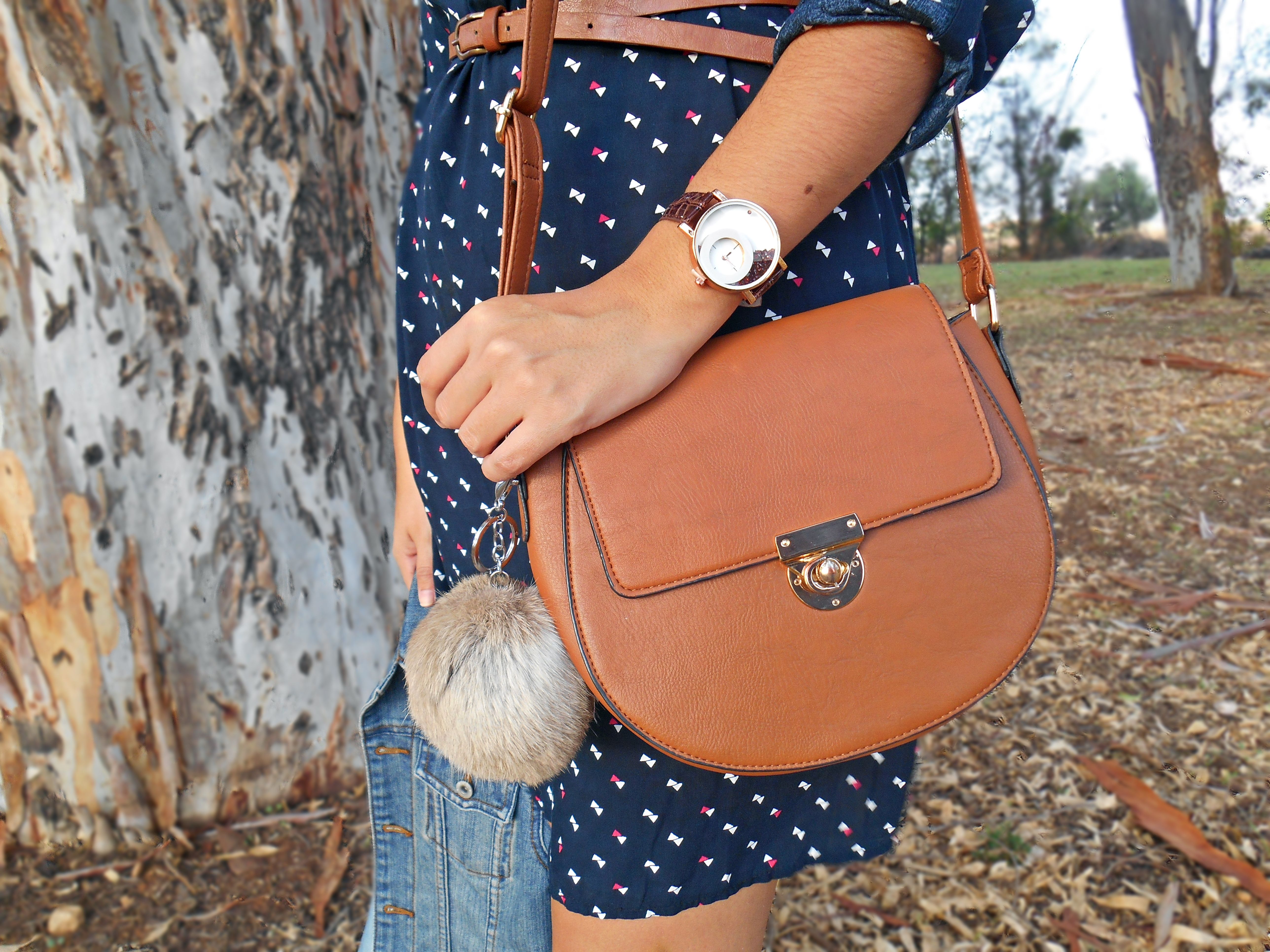 Después, tan sólo fui añadiéndole detalles como el cinturón marrón, para marcar la cintura, y el bolso a juego siendo del mismo tono, en el que colgué un redondo pompón simulando a una cola de conejo.