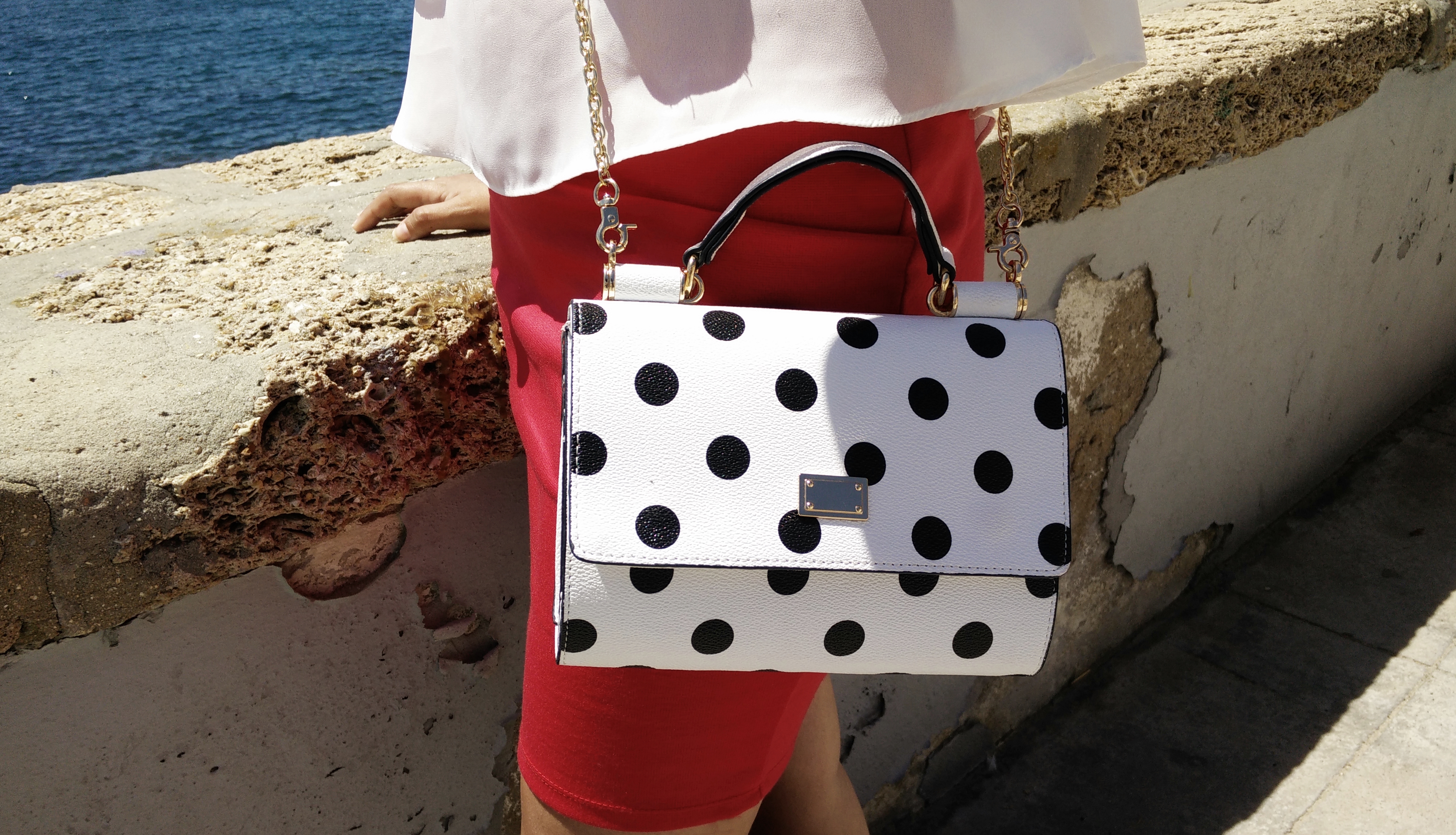Llevo falda lápiz en color rojo, junto con blusa blanca de volantes y sin mangas, además, ¡un bolsito muy flamenco que me tiene enamorada!