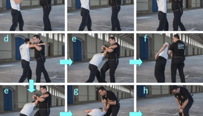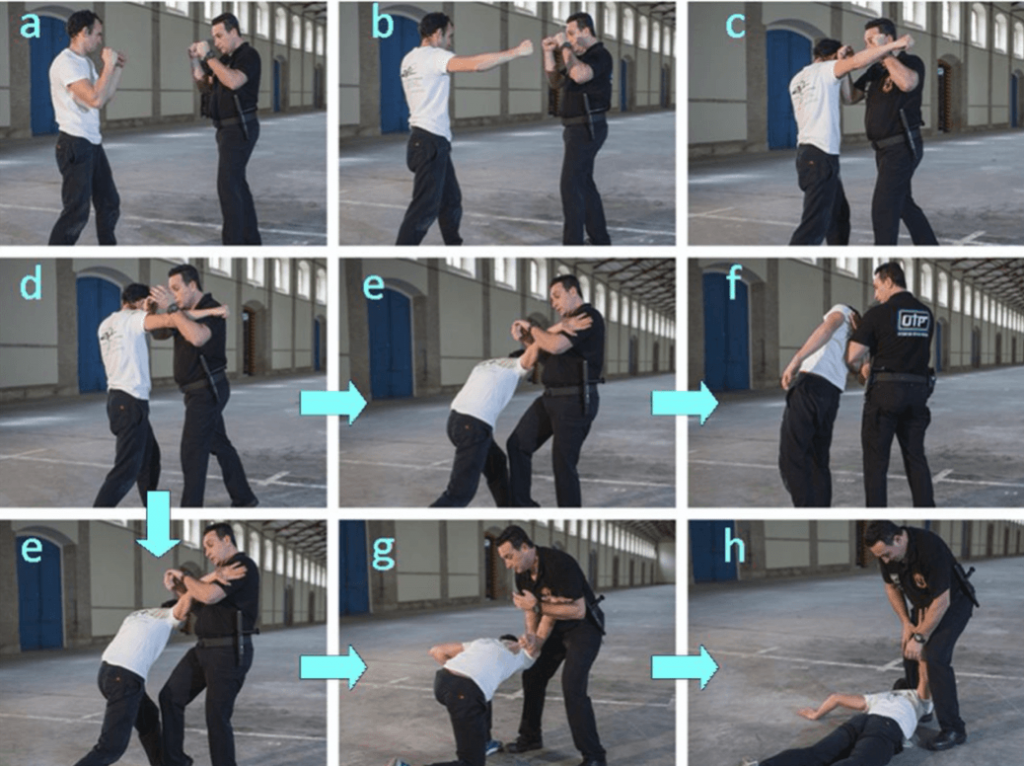 Pasos de las técnicas de intervención física (OTP) 1 (respuesta a un ataque de golpe circular). ( a ) Se enfrenta al oponente en posición de guardia. ( b ) El oponente carga contra el oficial. ( c ) El oficial con sus antebrazo bloquea el brazo delantero del oponente. ( d ) El oficial suelta el brazo que utilizó anteriormente para bloquear el brazo del oponente. ( e ) El brazo previamente liberado del oficial se usa para agarrar al oponente y romper su equilibrio con un golpe de rodilla en la pierna retrasada del oponente. Después de esta imagen, las flechas indican el flujo de movimiento entre el oficial y el oponente. Este último puede realizarse de dos maneras diferentes (como se muestra en f o g y h). ( f) Mientras está de pie, el oficial controla al oponente usando su antebrazo para ejercer una fuerte presión sobre el codo del oponente. ( g ) El oficial controla al oponente con el mismo antebrazo para bajarlo y mantenerlo doblado. ( h ) El oficial continúa ejerciendo más presión con el antebrazo para llevar al oponente al suelo.